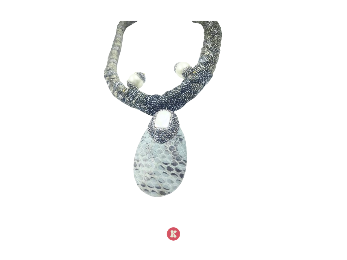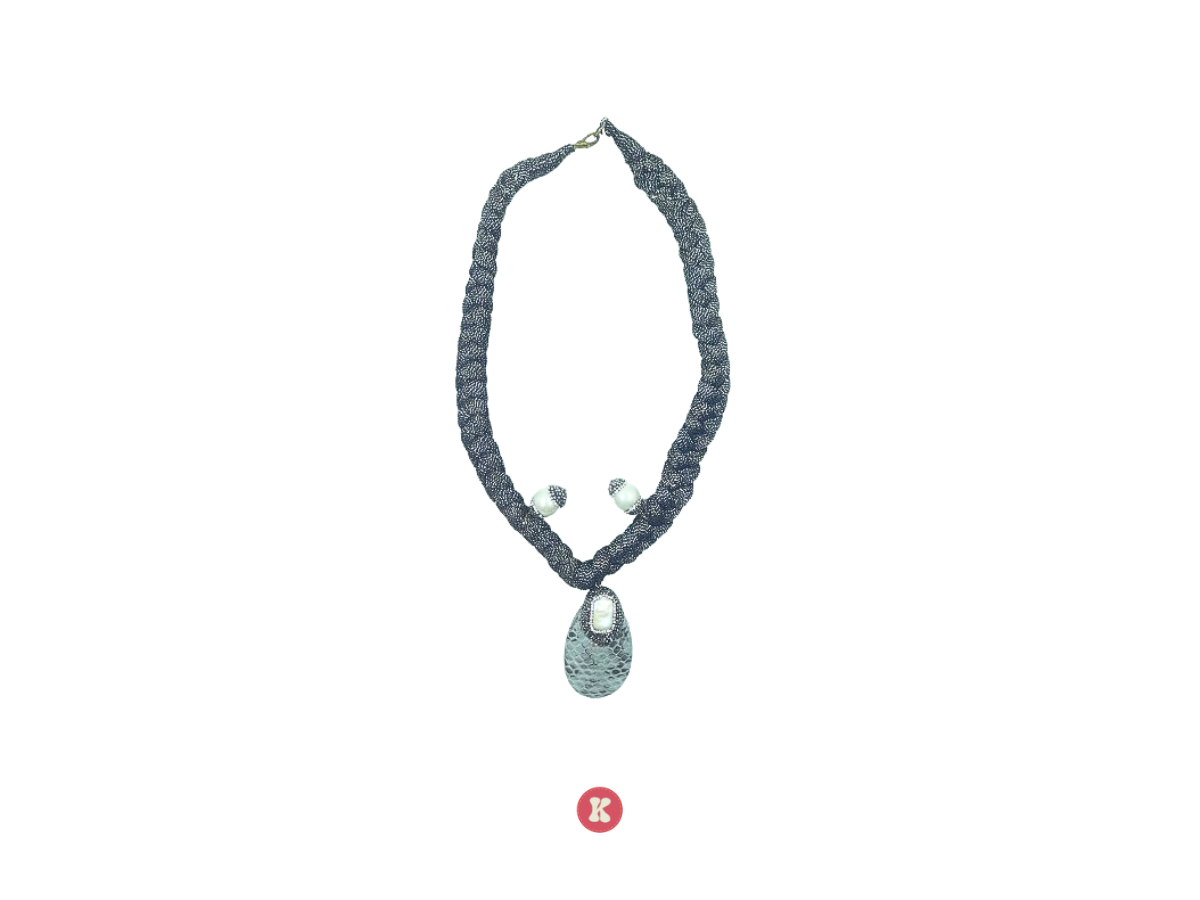 A stylish necklace featuring a braided black and silver chain. and teardrop pendant with a textured design and pearl accents. Use for Ideal for enhancing both casual and formal outfits.