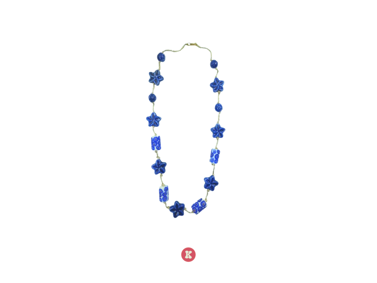 A handcrafted necklace featuring vibrant blue ceramic beads with star and cylindrical patterns strung on a delicate gold cord. Perfect for adding a pop to summer outfits or beach attire.