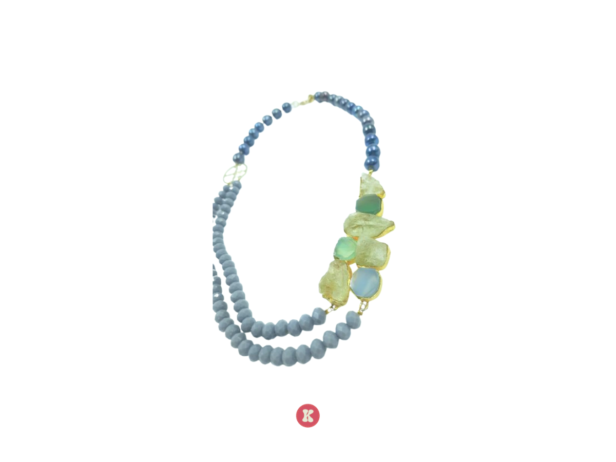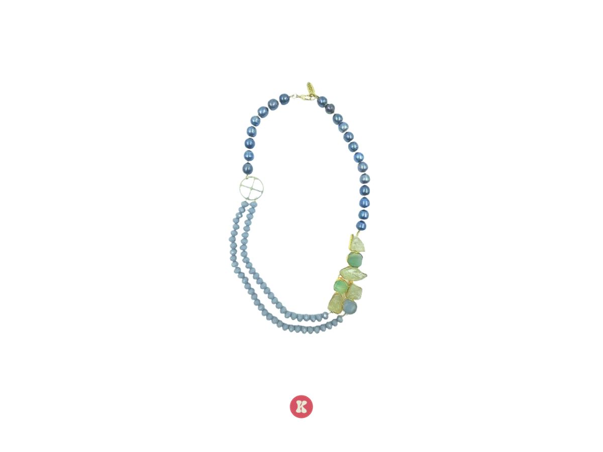 A unique necklace blending glossy navy beads, matte blue strands, and raw-cut green stones for a modern, earthy appeal. Used for Perfect for contemporary outfits.