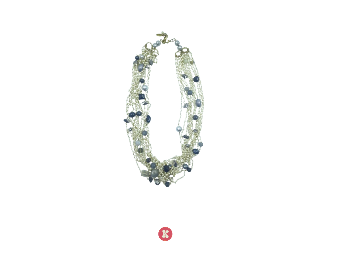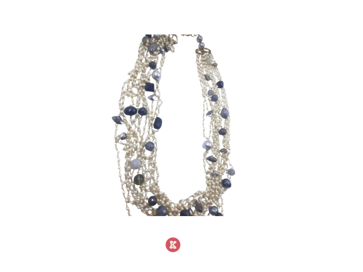 This luxurious multi-layered necklace beautifully intertwines lustrous pearls with deep blue gemstones.Perfect for enhancing formal attire at weddings or gala events.