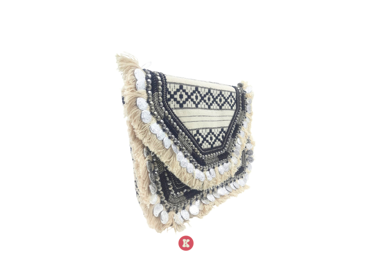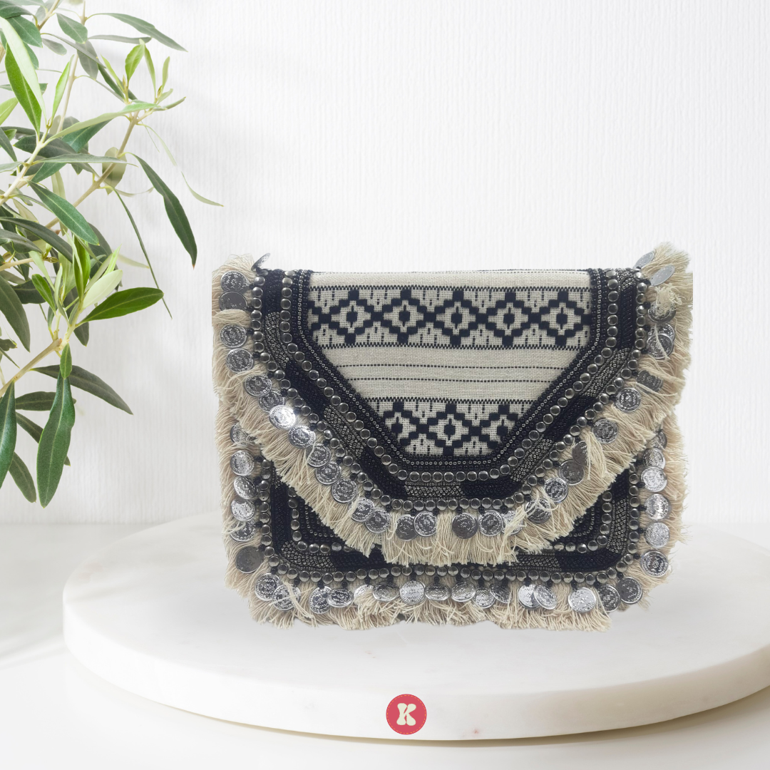 The Tribal Coin Fringe Bag showcases a striking black and white geometric pattern with silver coin embellishments and fringe, perfect for carrying essentials with a bold, ethnic-inspired style.