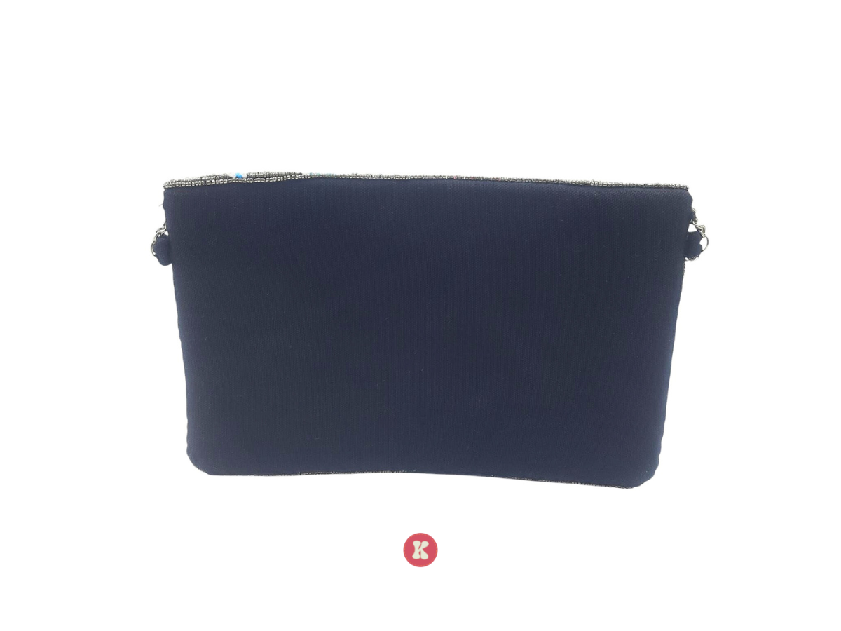 This beaded clutch features an intricate floral design with vibrant pink, red, and teal accents.