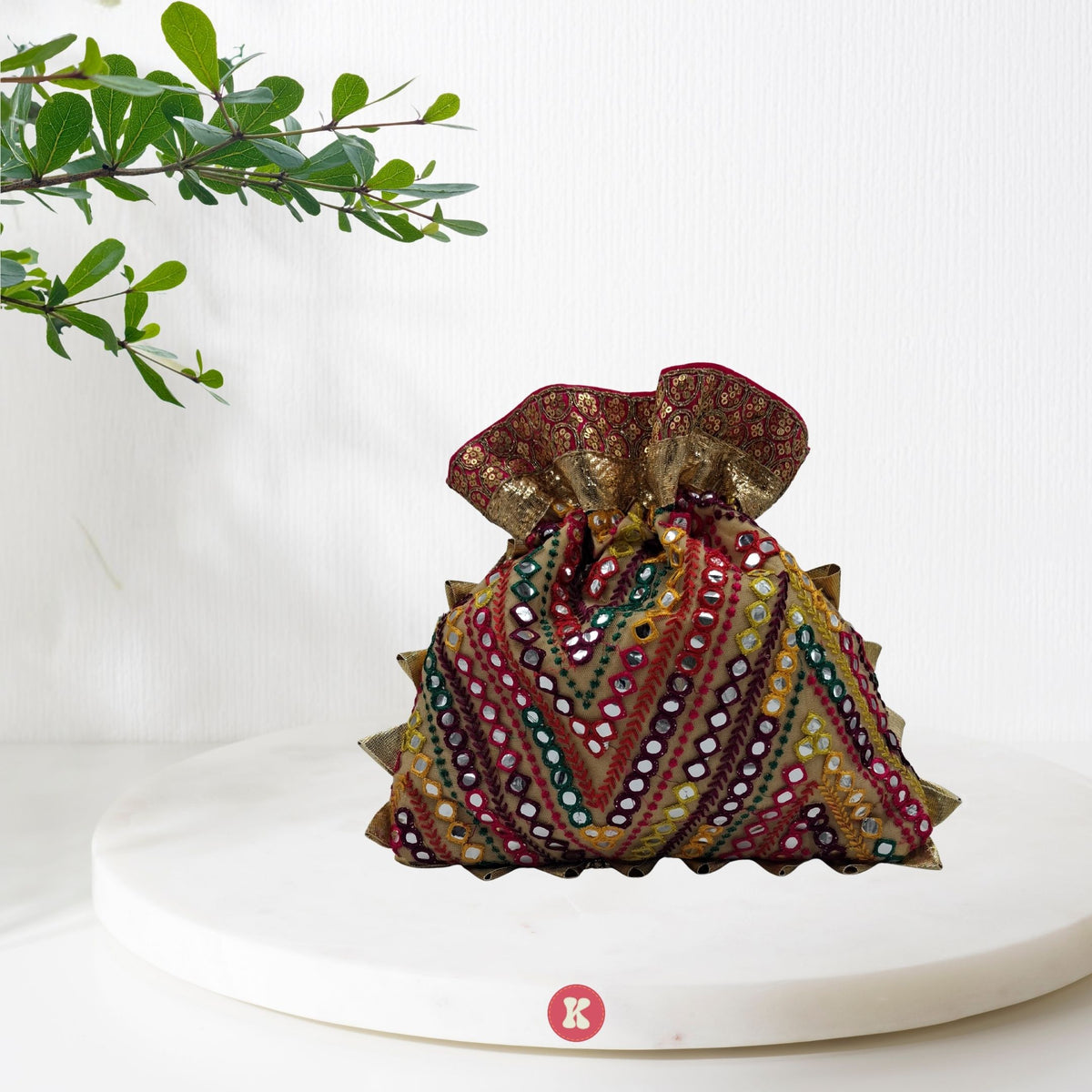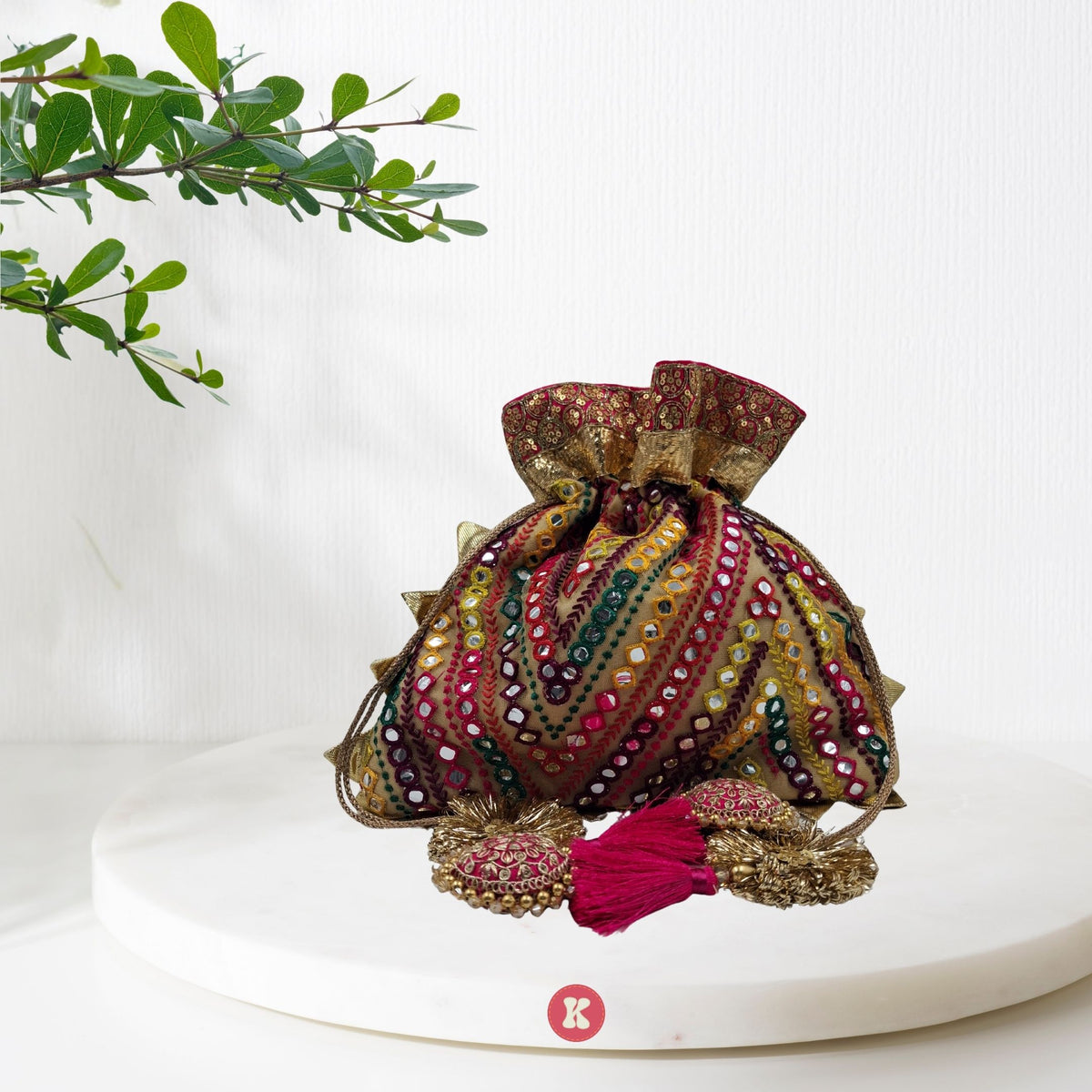Glamorous golden potli with vibrant mirror work, sequin stripes, and red tassels—perfect for weddings.