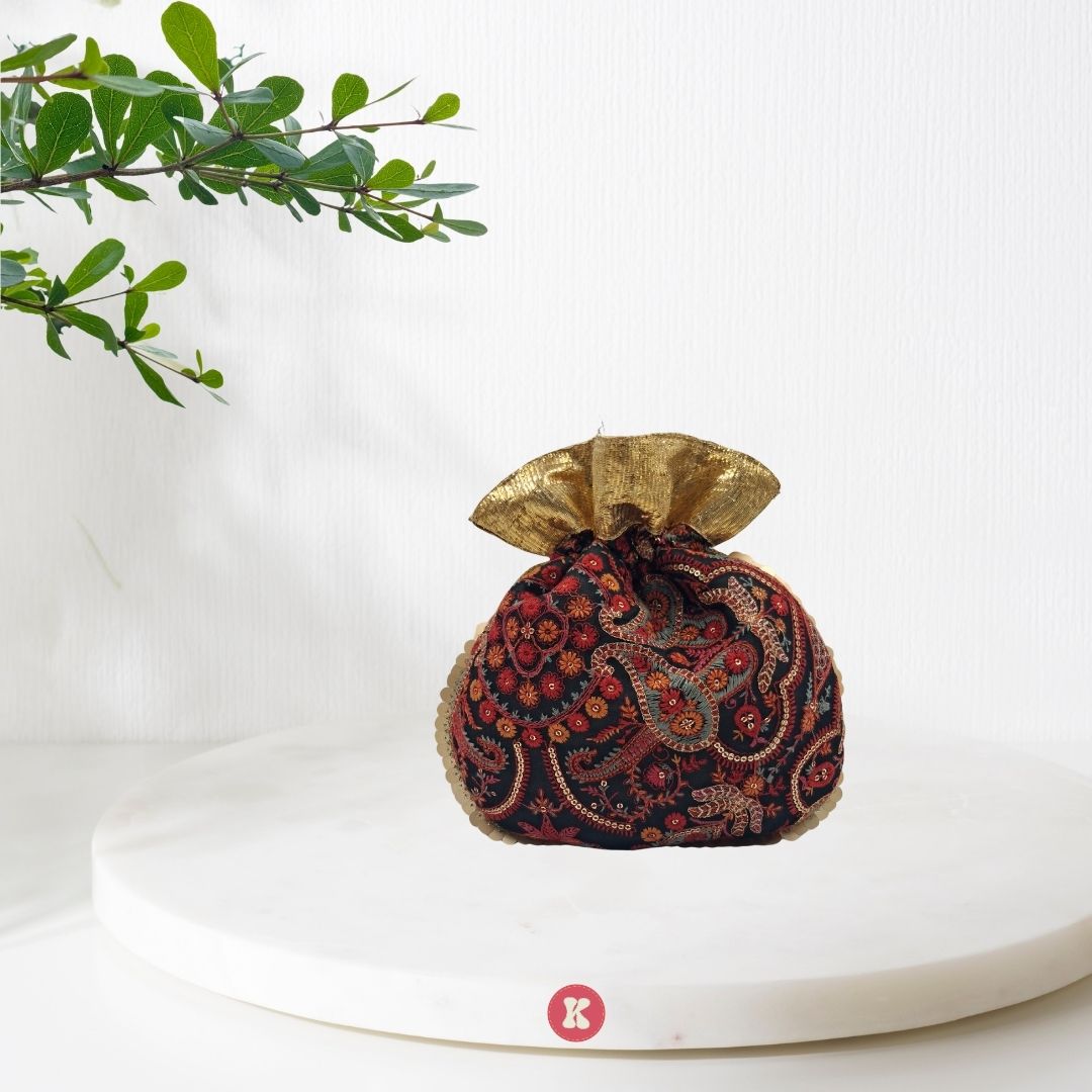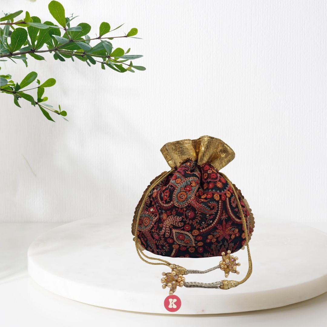 Regal maroon velvet potli adorned with intricate zari embroidery and pearl-tipped drawstrings — timeless elegance.