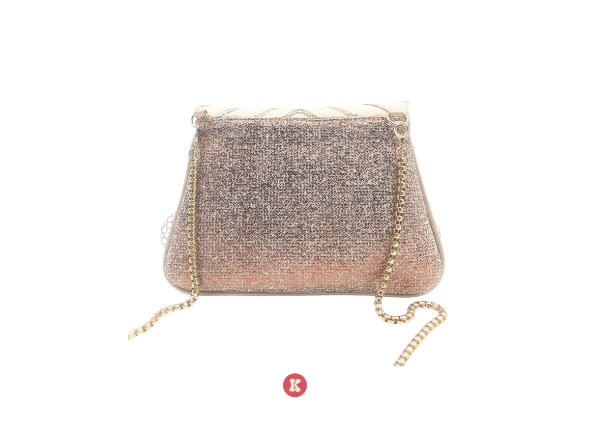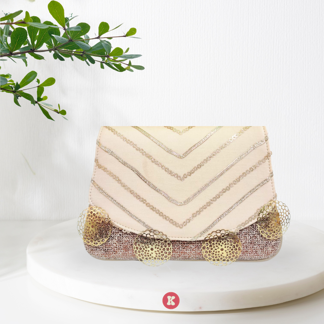 Bag features a soft beige hue with gold chevron detailing and unique metallic accents. This bag is designed to carry essentials with a touch of modern elegance.