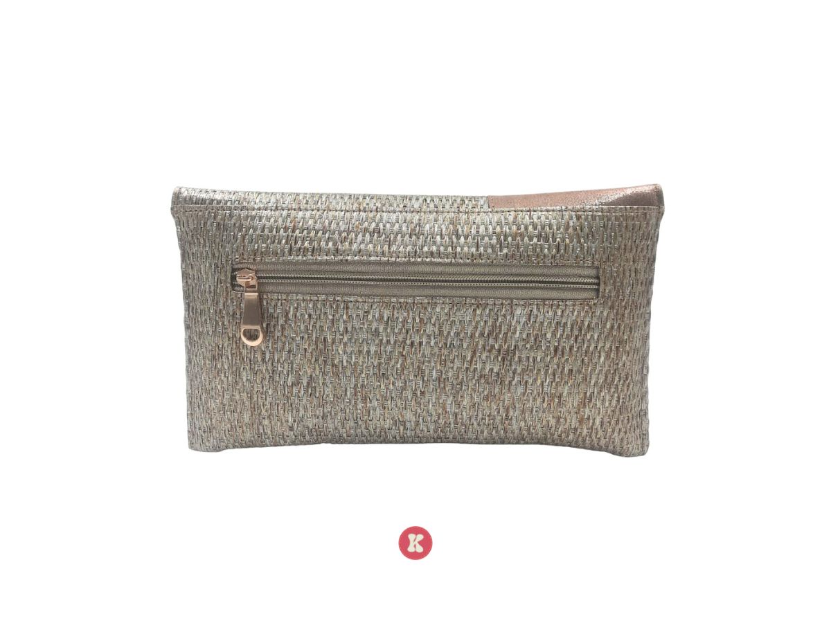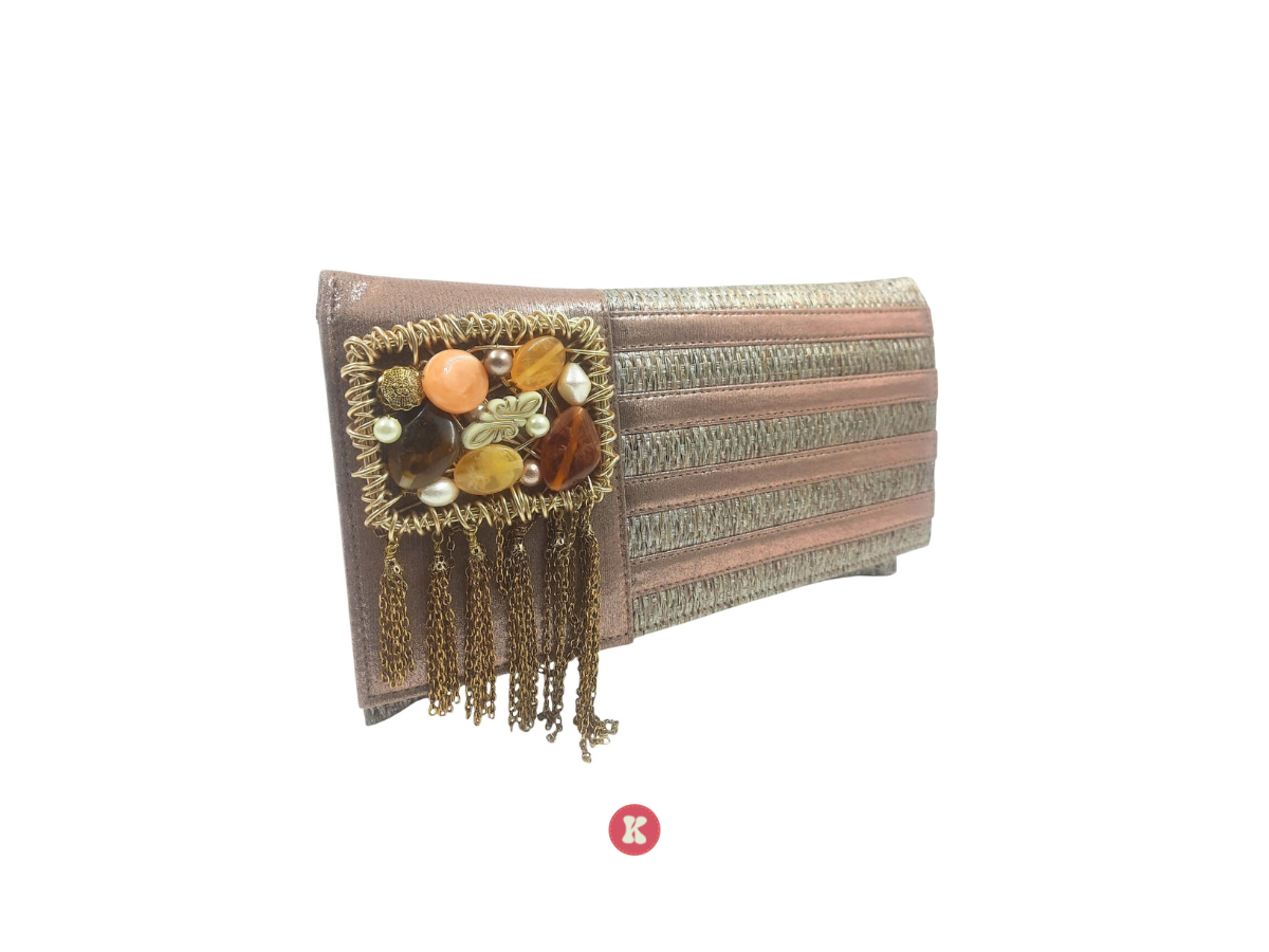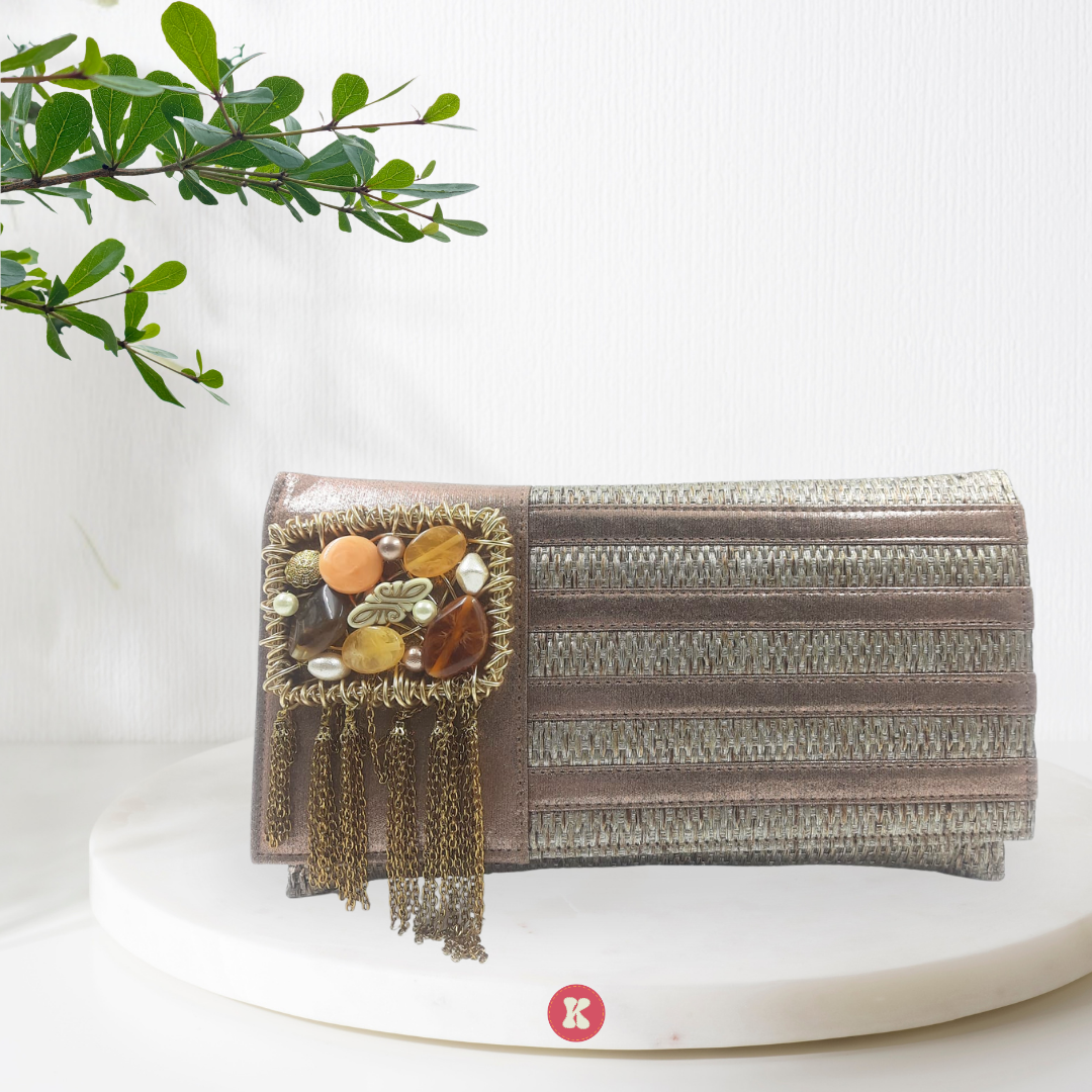 This metallic woven bag, adorned with gem and chain detail, creates a captivating, light-catching effect.