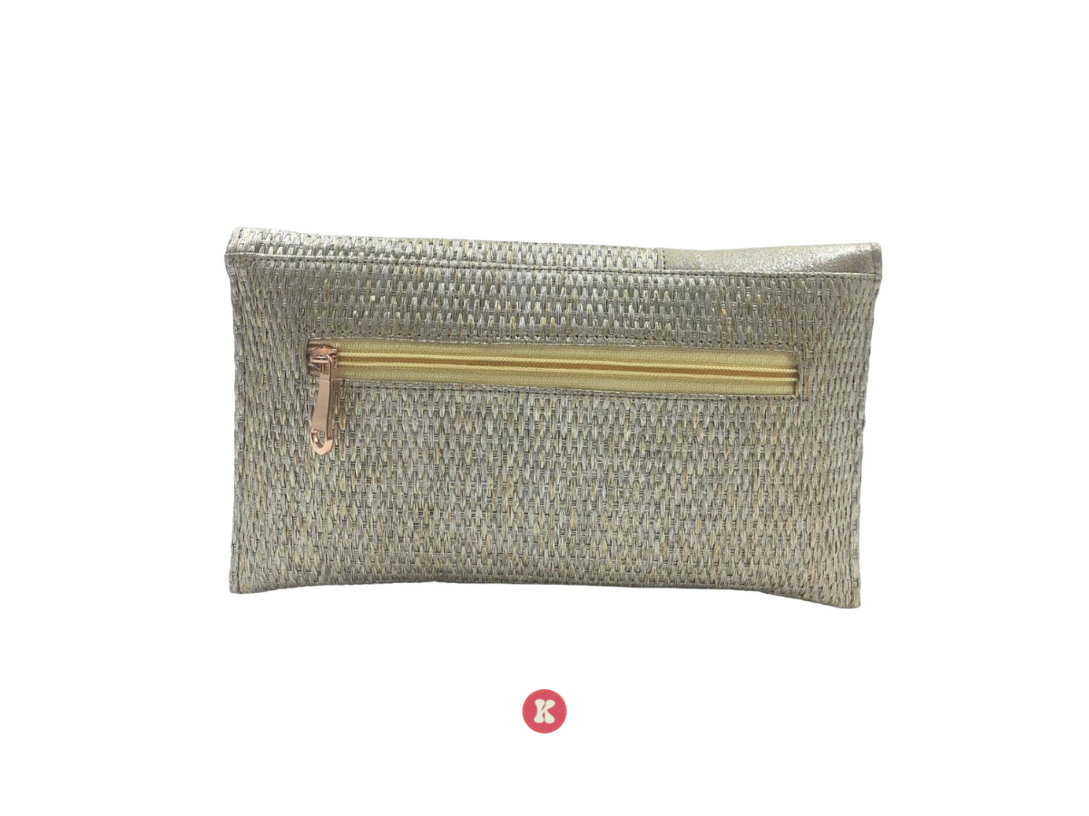 This metallic woven bag, adorned with a gemstone and chain embellishment. It's perfect for adding a touch of eclectic elegance to evening events .