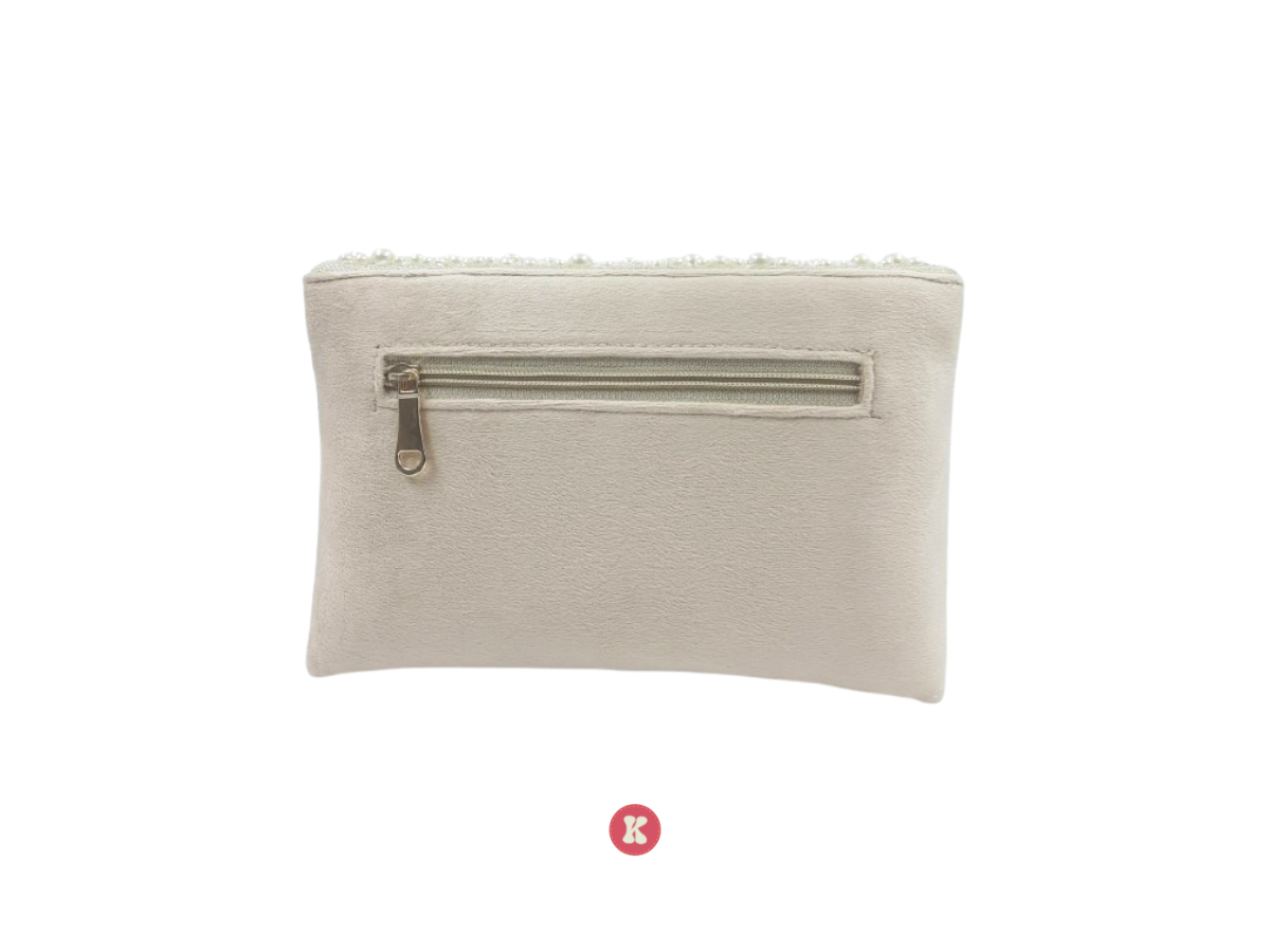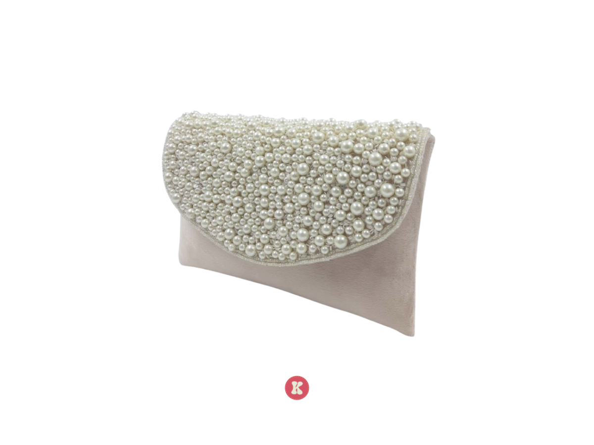 A chic, off-white clutch with a pearl-encrusted flap, offering a blend of elegance and texture. Perfect for formal events, weddings, or evening outings.