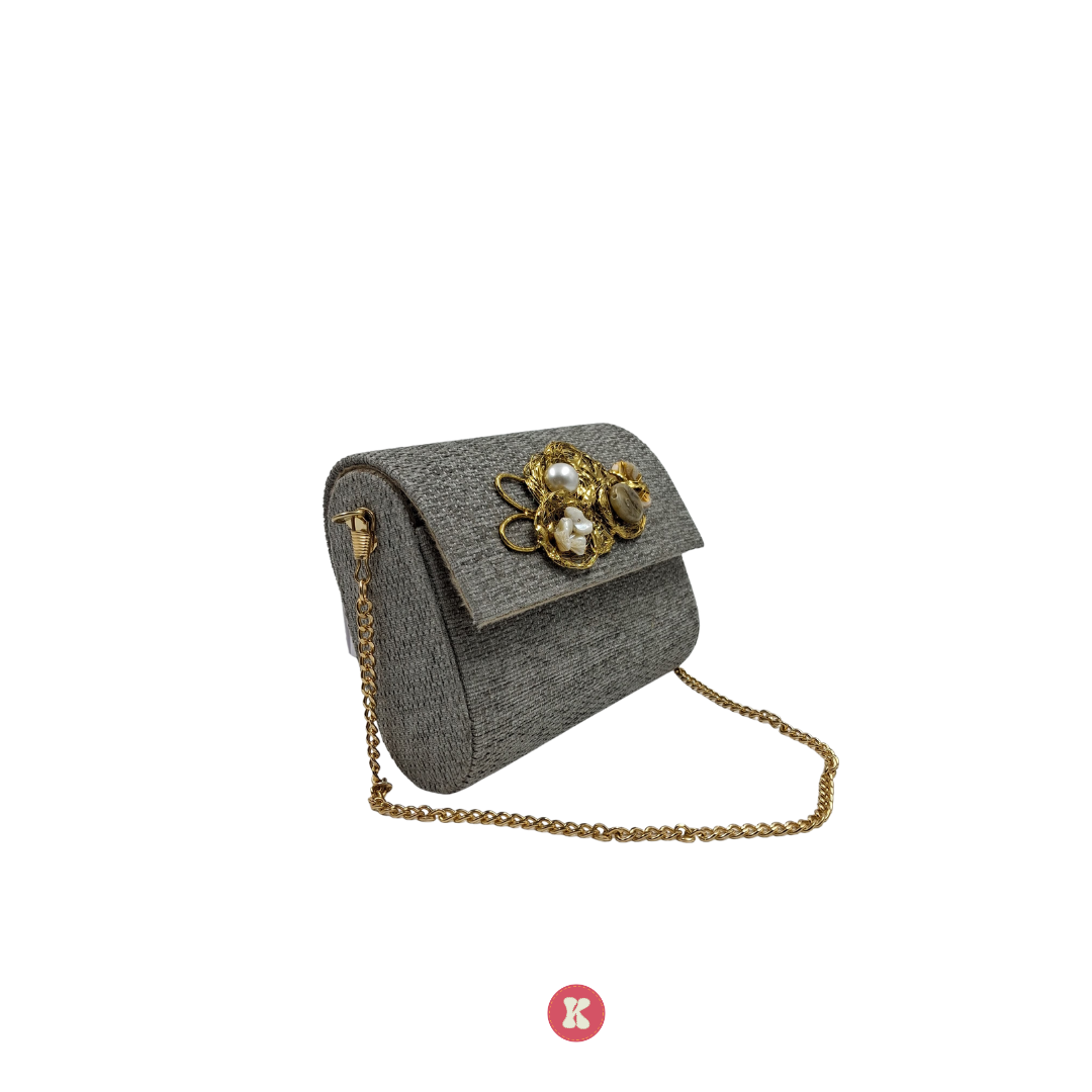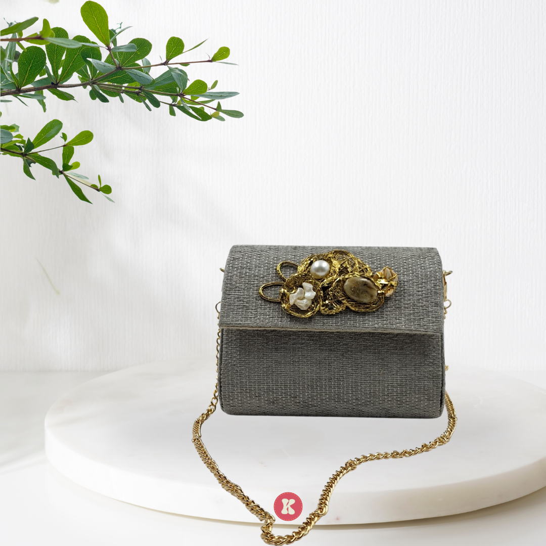 A minimalist grey clutch elevated with abstract gold and pearl embellishments