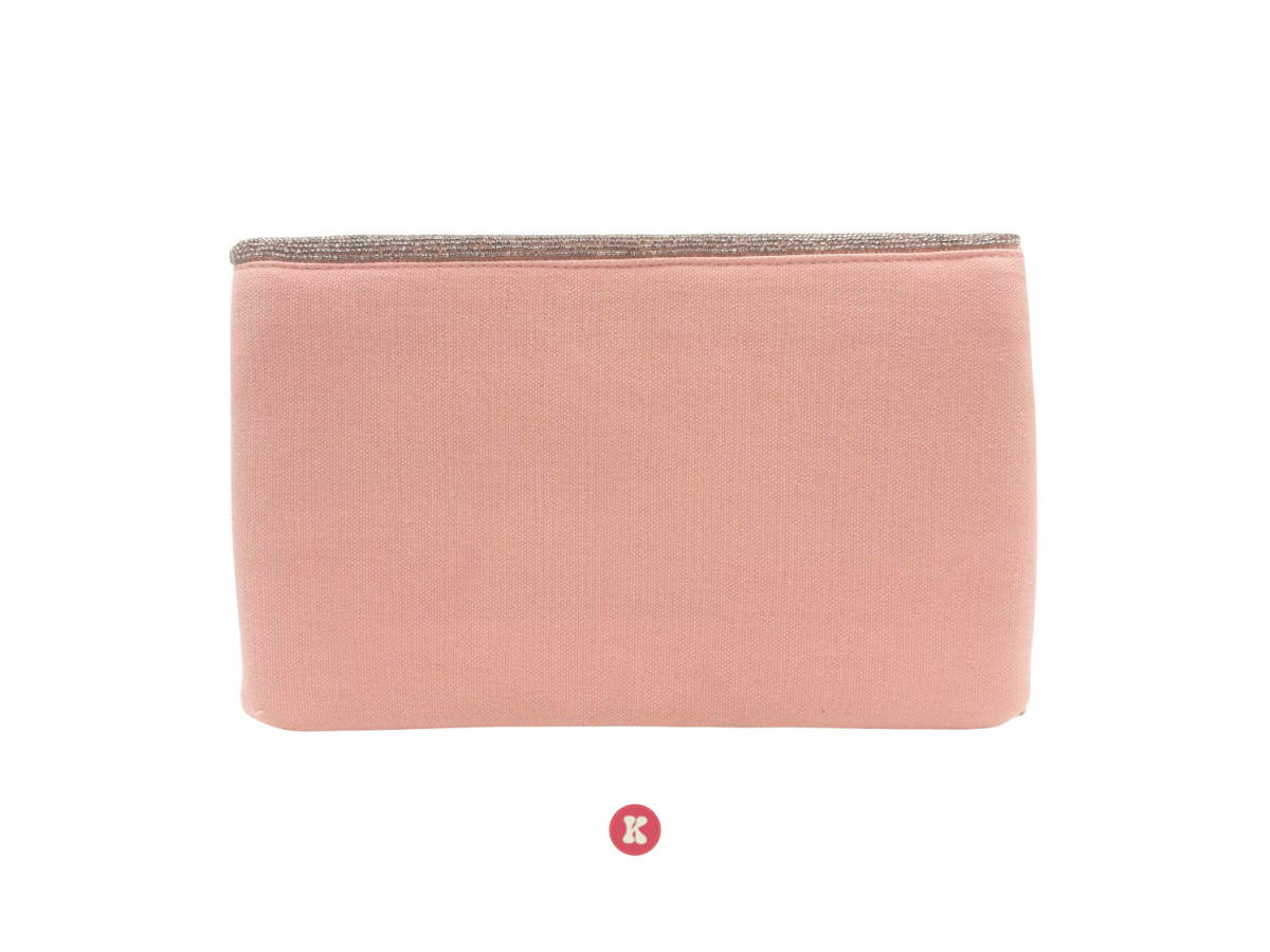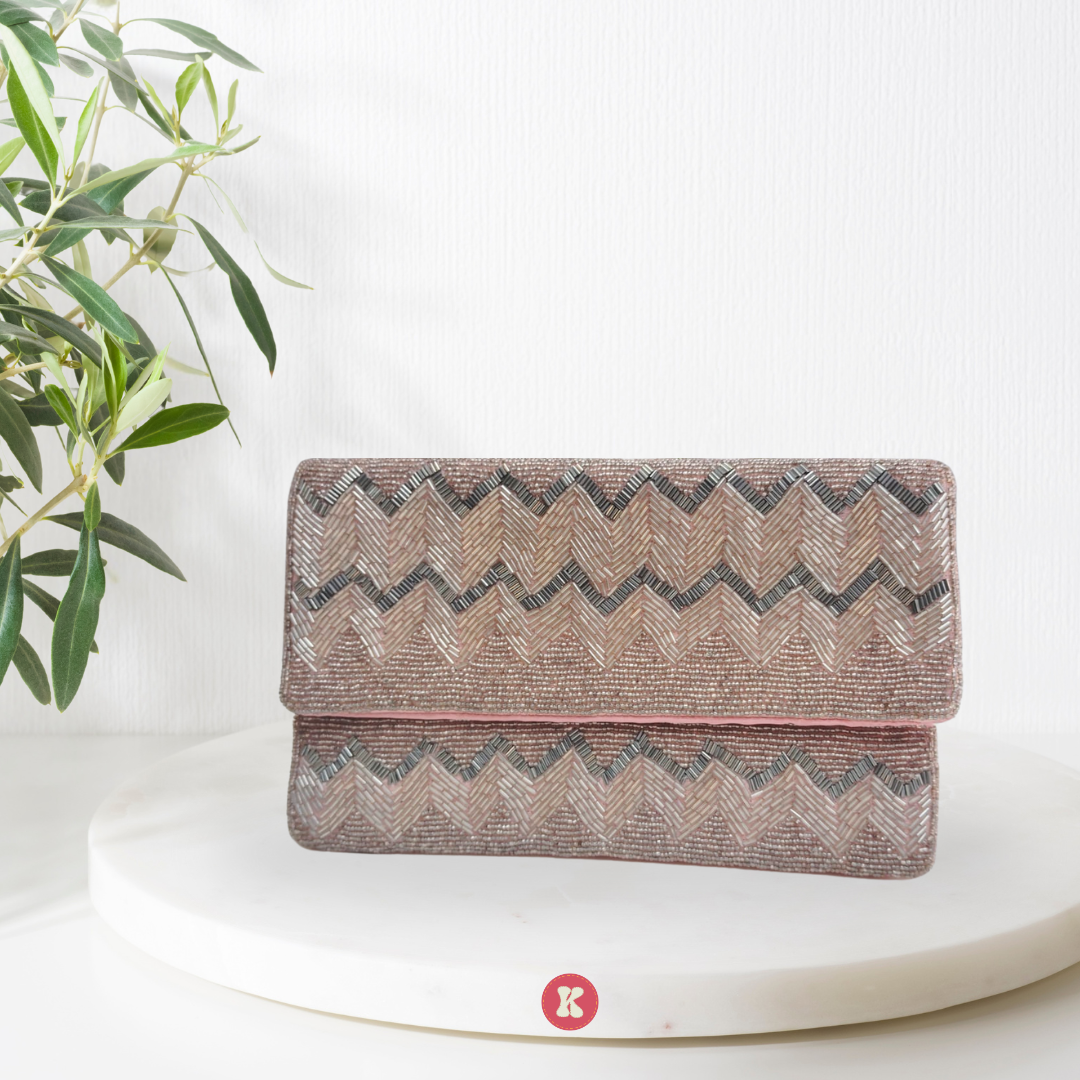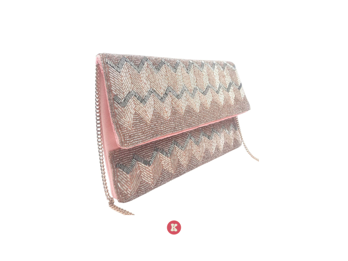 Elegant bag featuring meticulous zigzag beadwork in rose gold and silver tones with chain strap, perfect for adding sophisticated sparkle to formal occasions.