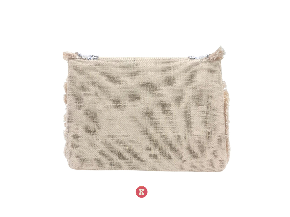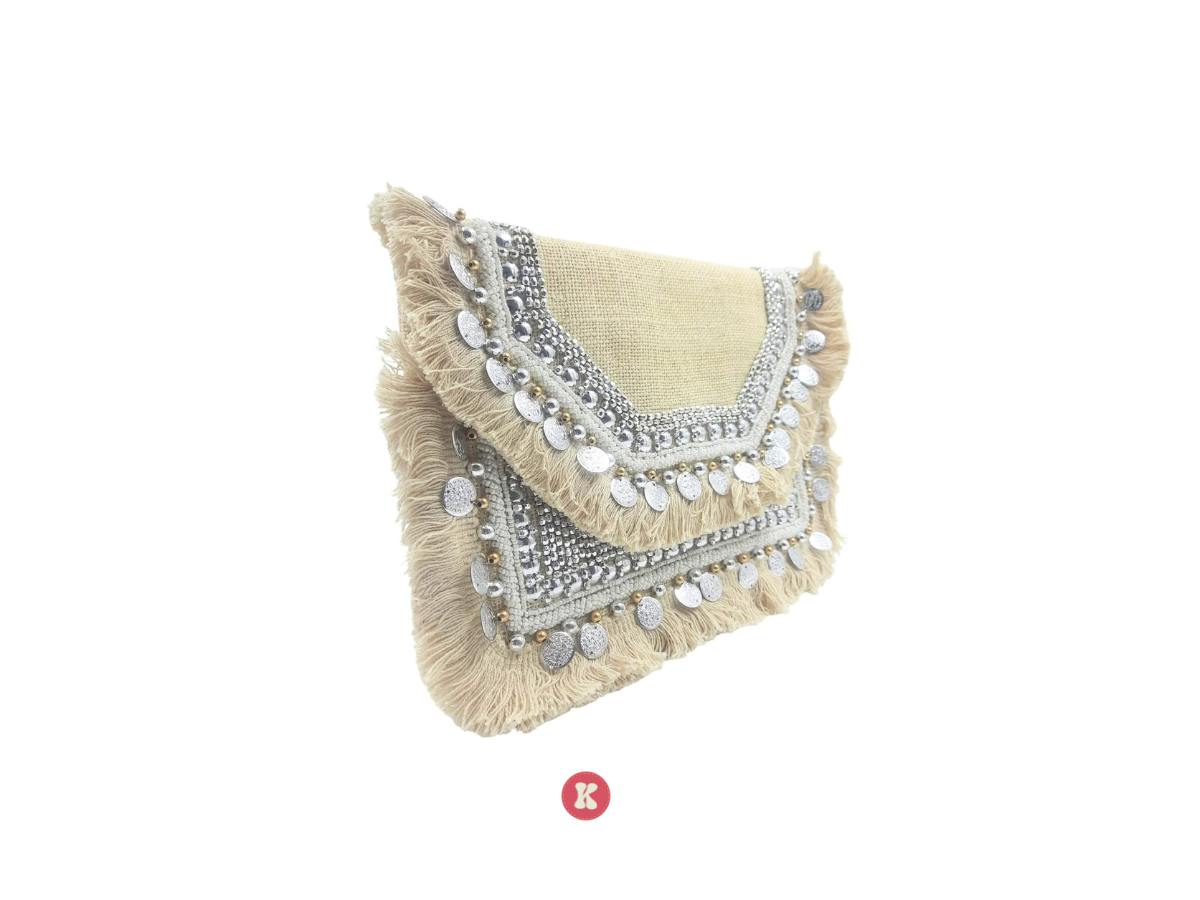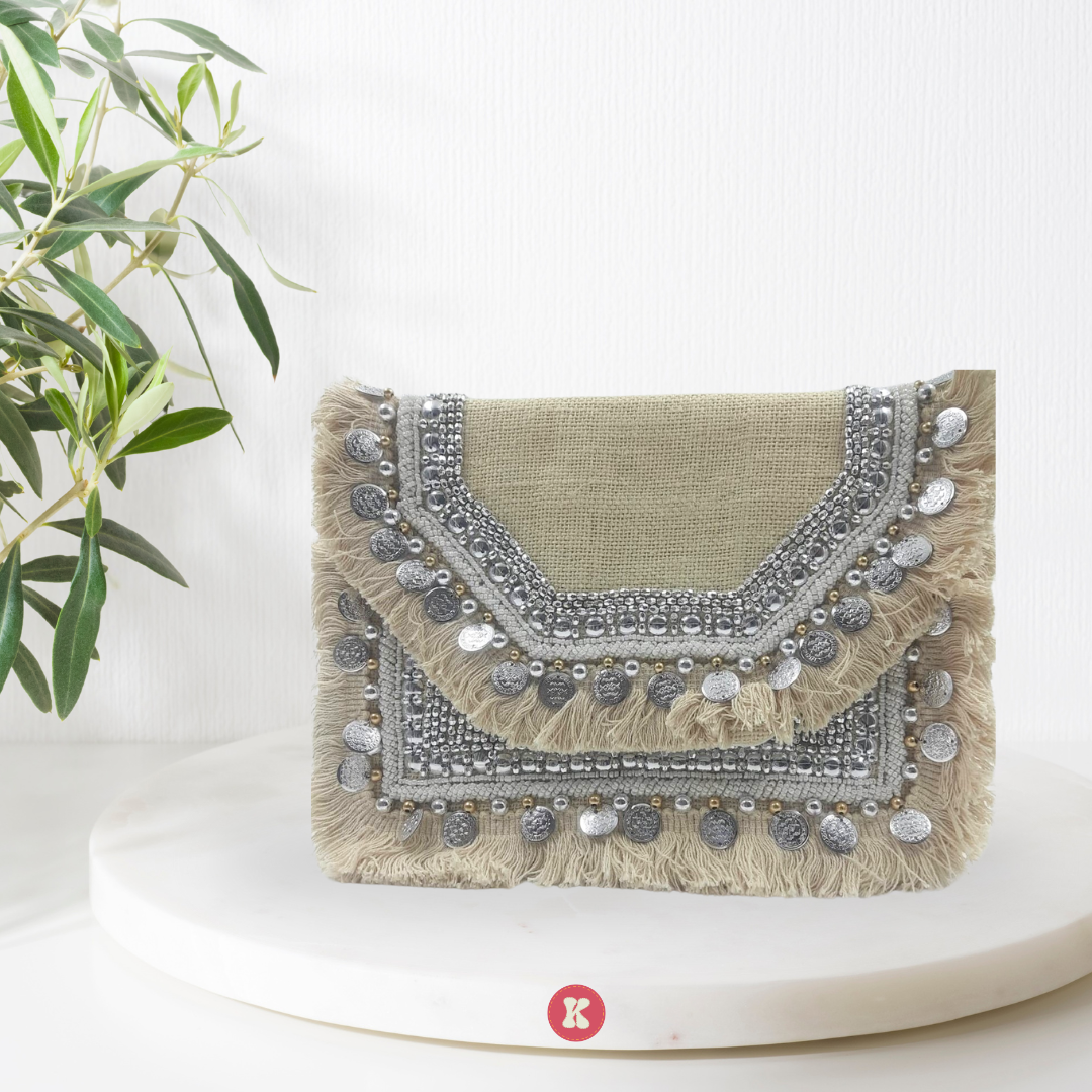Rustic charm with beaded coins Fringe Bag features a natural burlap texture with silver coin embellishments and fringe, perfect for carrying essentials with a bohemian, festival-inspired style.