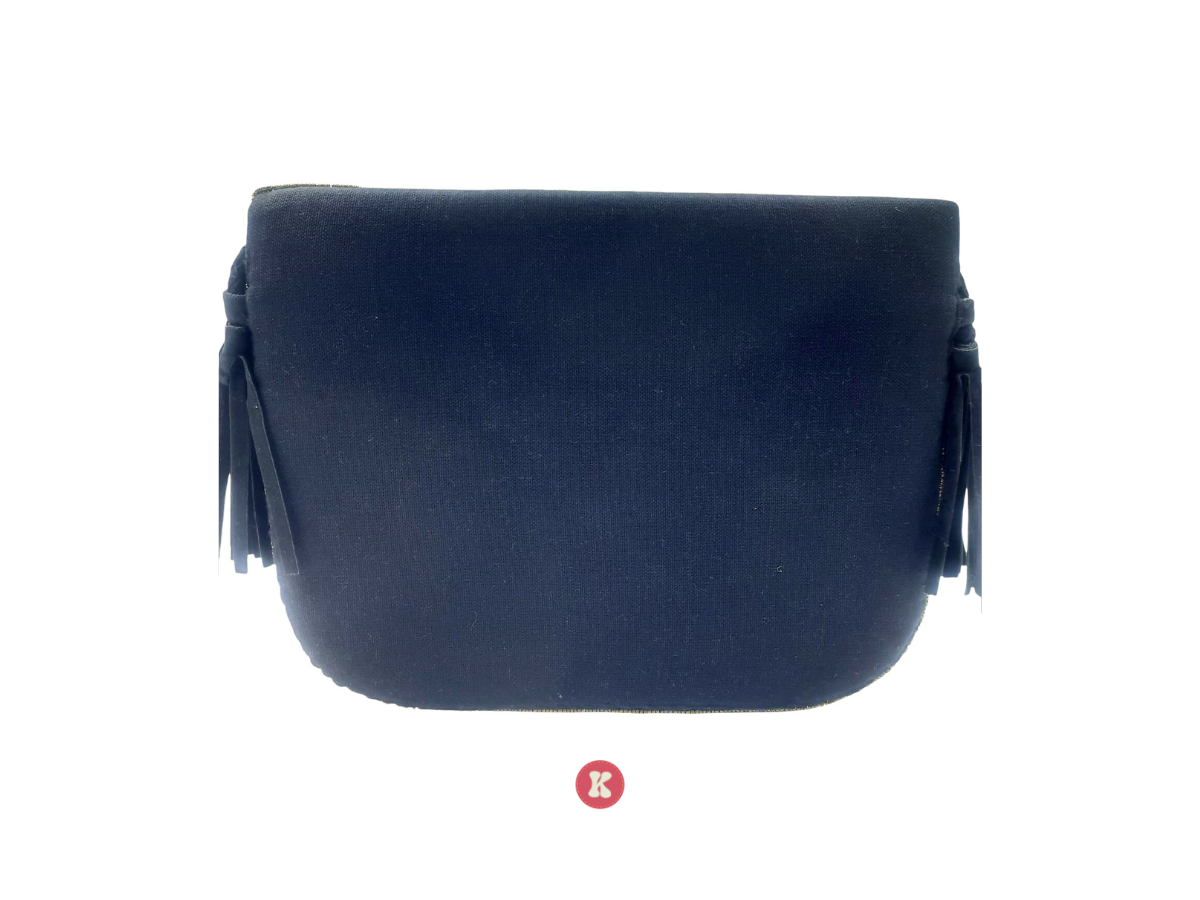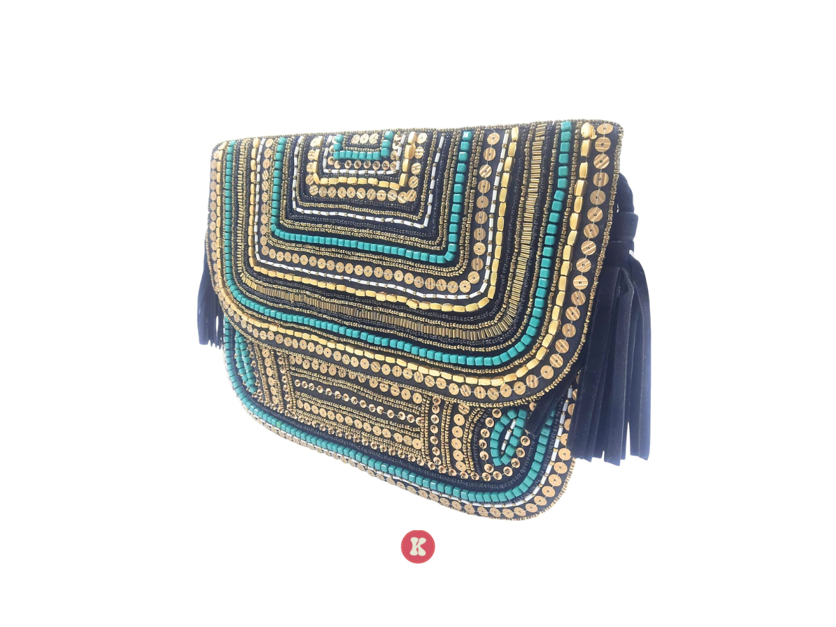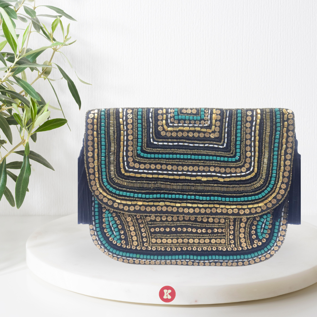 This striking black clutch is adorned with intricate gold, turquoise, and black beadwork in a mesmerizing layered pattern. Perfect for evening parties, weddings, or festive gatherings.