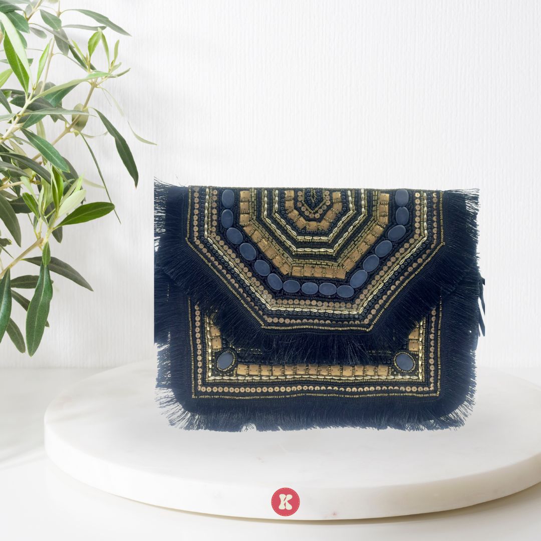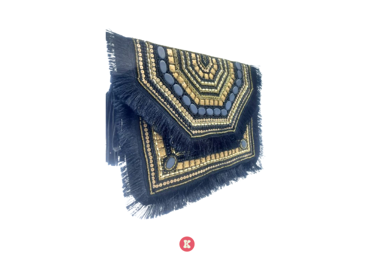 The Midnight Mosaic Beaded Bag features a striking black and gold design with intricate beadwork, perfect for carrying essentials with an edgy, elegant touch. Made in India.