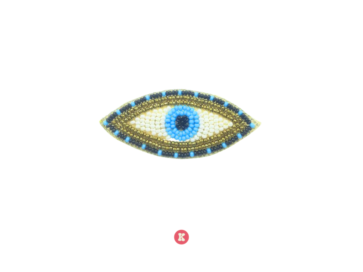 Intricately beaded evil eye patch featuring concentric rings of black, blue, white, and gold beads. Commonly used as a decorative charm on clothes, bags, or accessories.