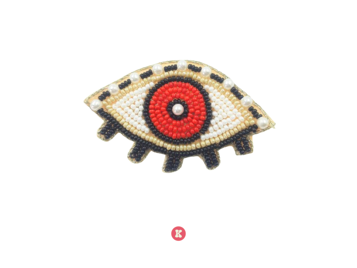 A beaded eye-shaped talisman symbolizing protection, featuring vibrant red, black, and pearl accents.