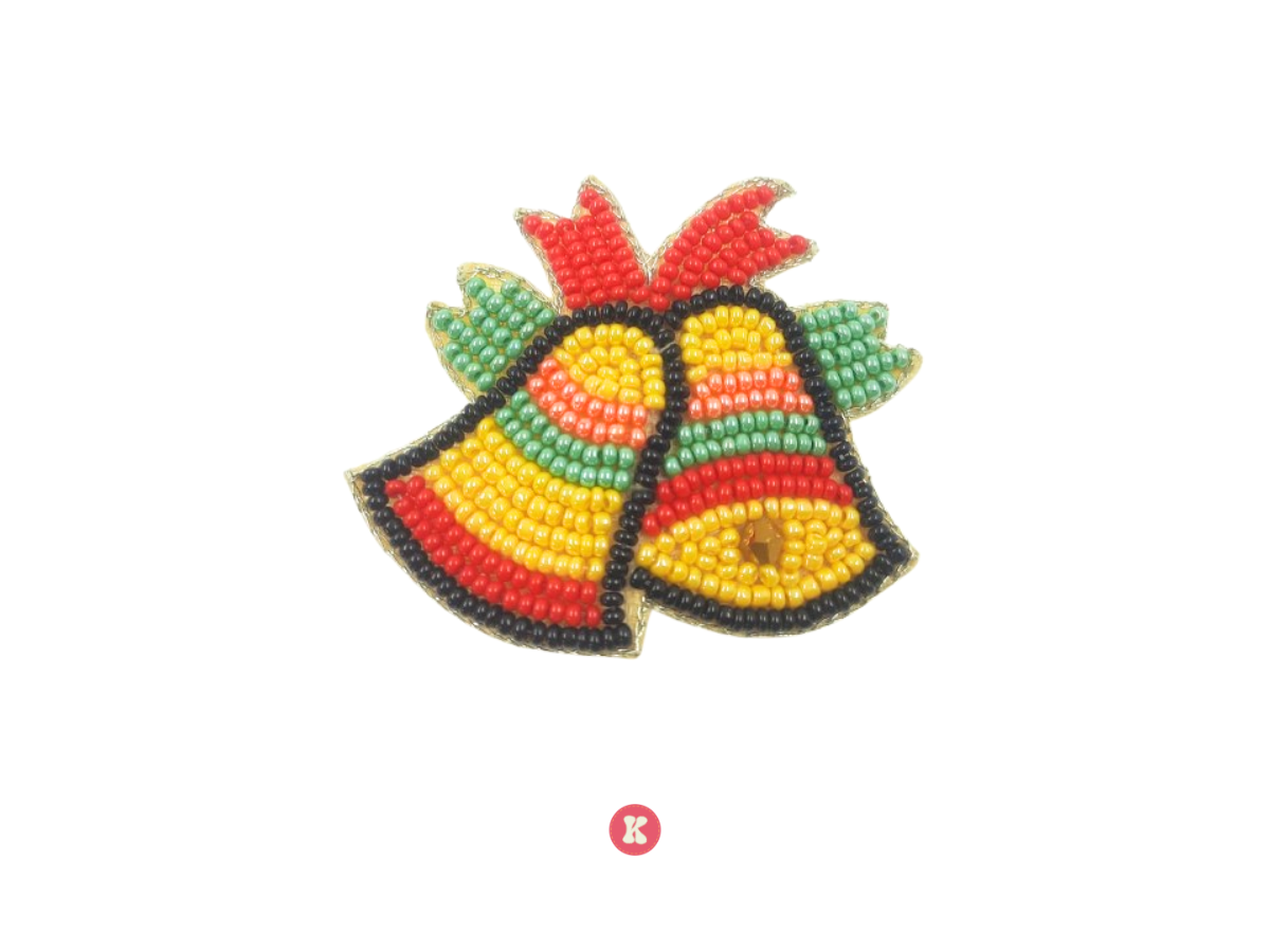Vibrant beaded Christmas bells in red, yellow, green, and black, accented with festive detailing. Great for holiday-themed decorations, gift wraps.