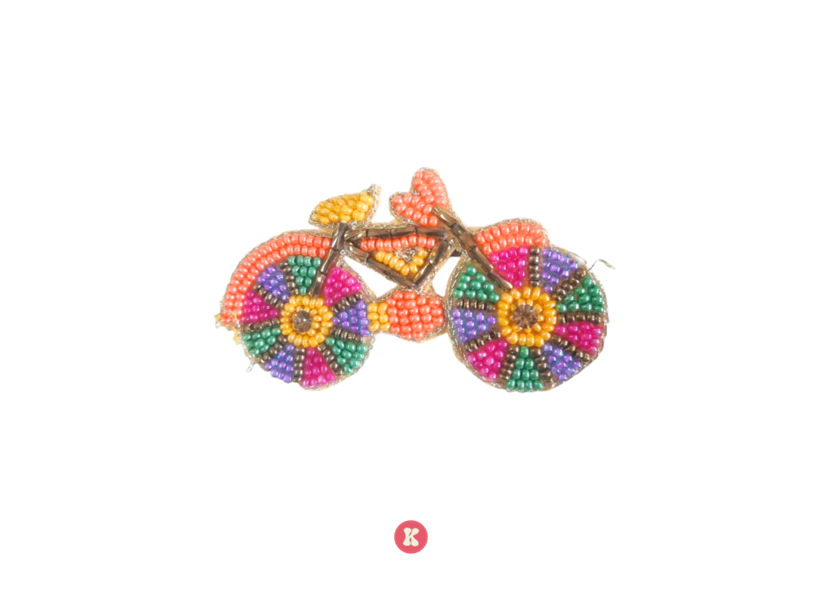 This vibrant beaded bicycle patch features a rainbow of colors arranged in playful geometric patterns. Perfect for kids’ apparel, tote bags, or quirky fashion statements.