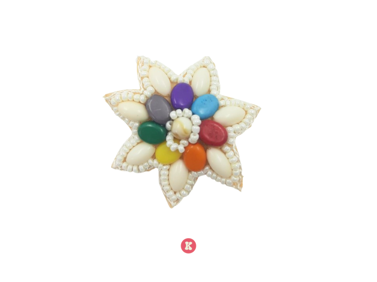 Colorful handmade flower with beads and stones arranged in a star pattern on a fabric base. Perfect as a decorative accessory for traditional crafts, festive decor, or ethnic fashion embellishment.