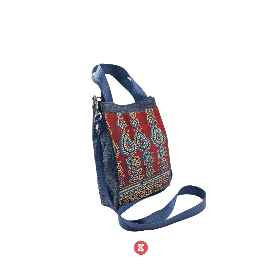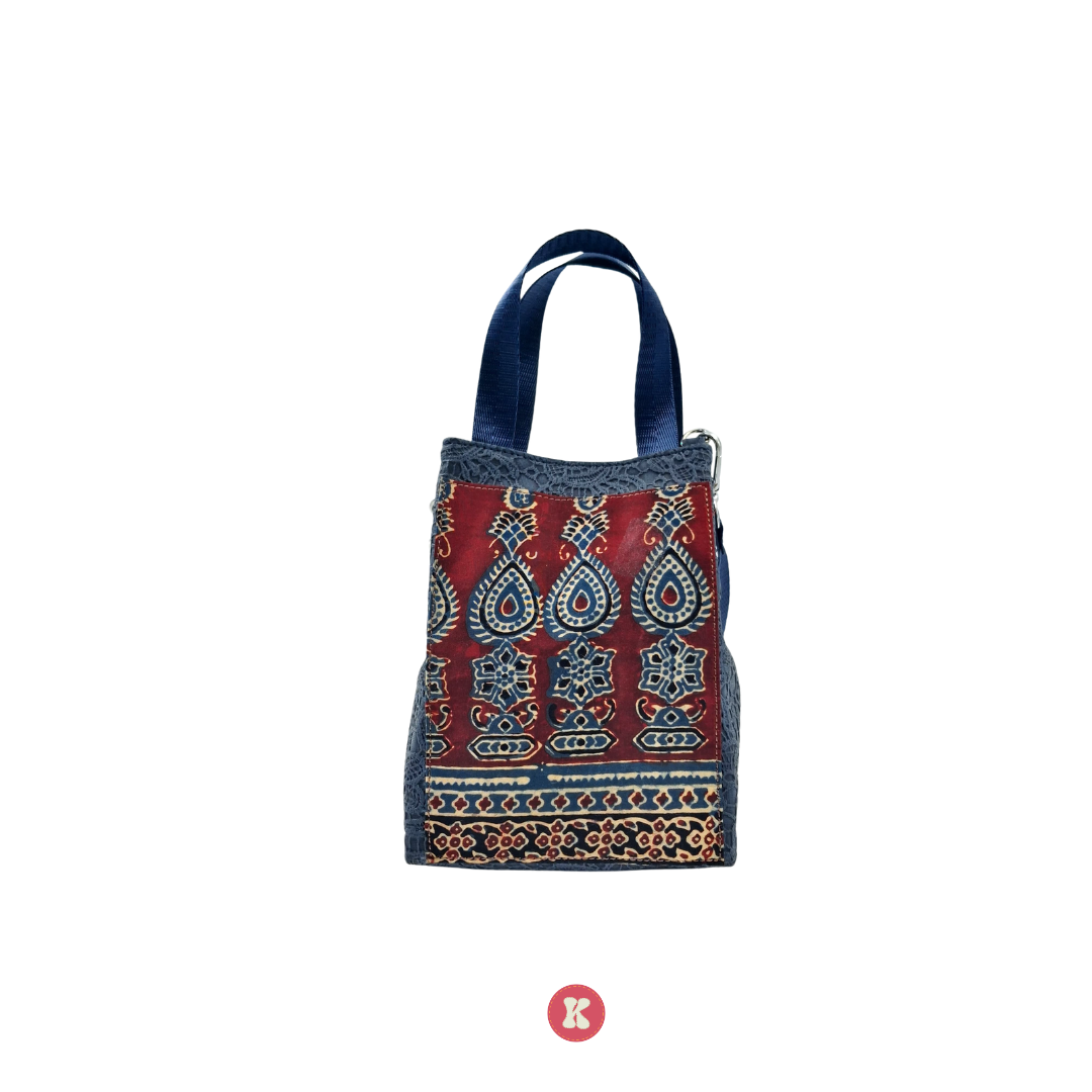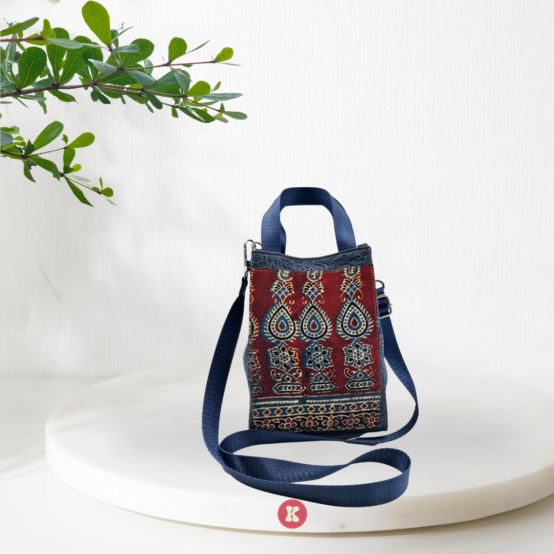 This handcrafted sling features timeless Ajrakh patterns and blue handles for an effortlessly ethnic vibe.