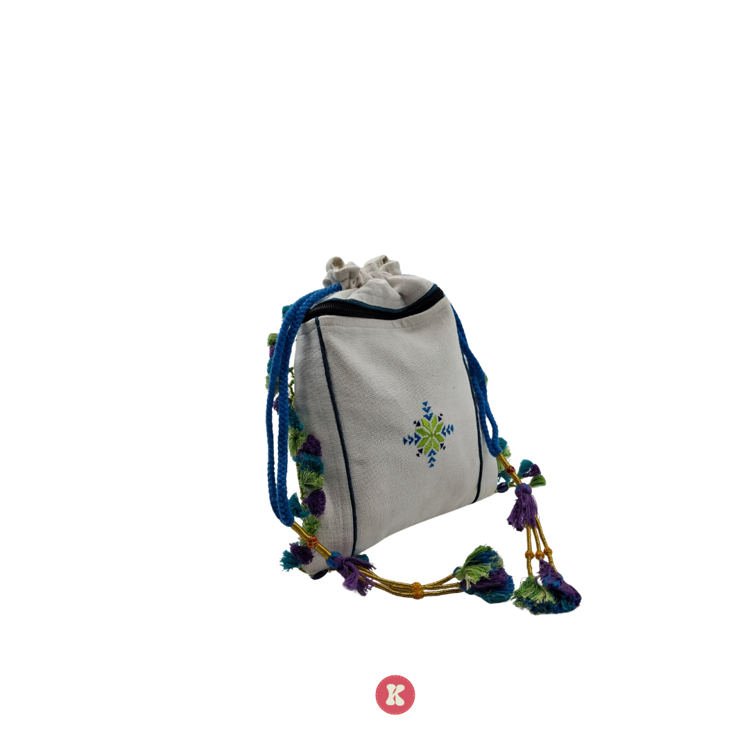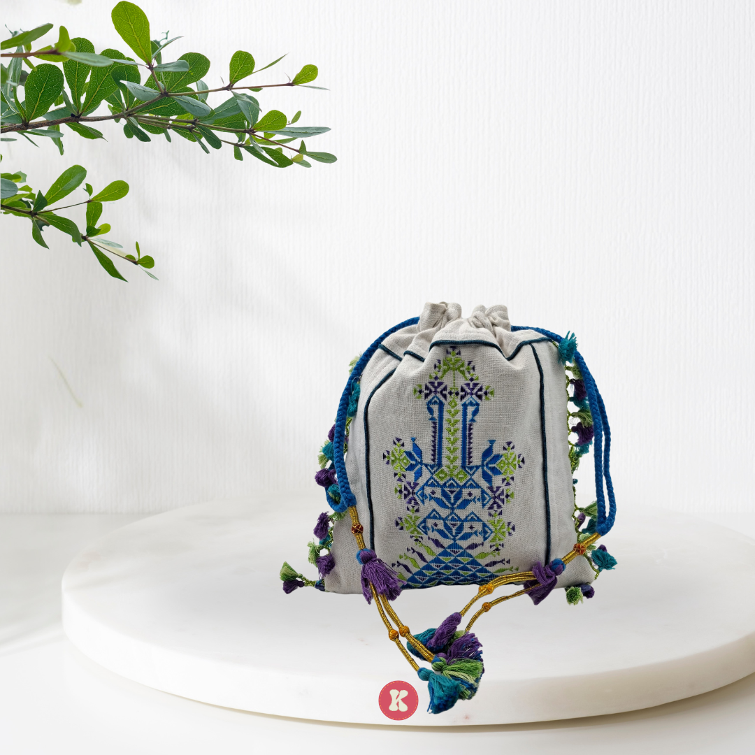 Accented with colorful tassels and a soft drawstring closure, this cotton potli is perfect for adding a touch of ethnic elegance to festive outfits or gifting with love.
