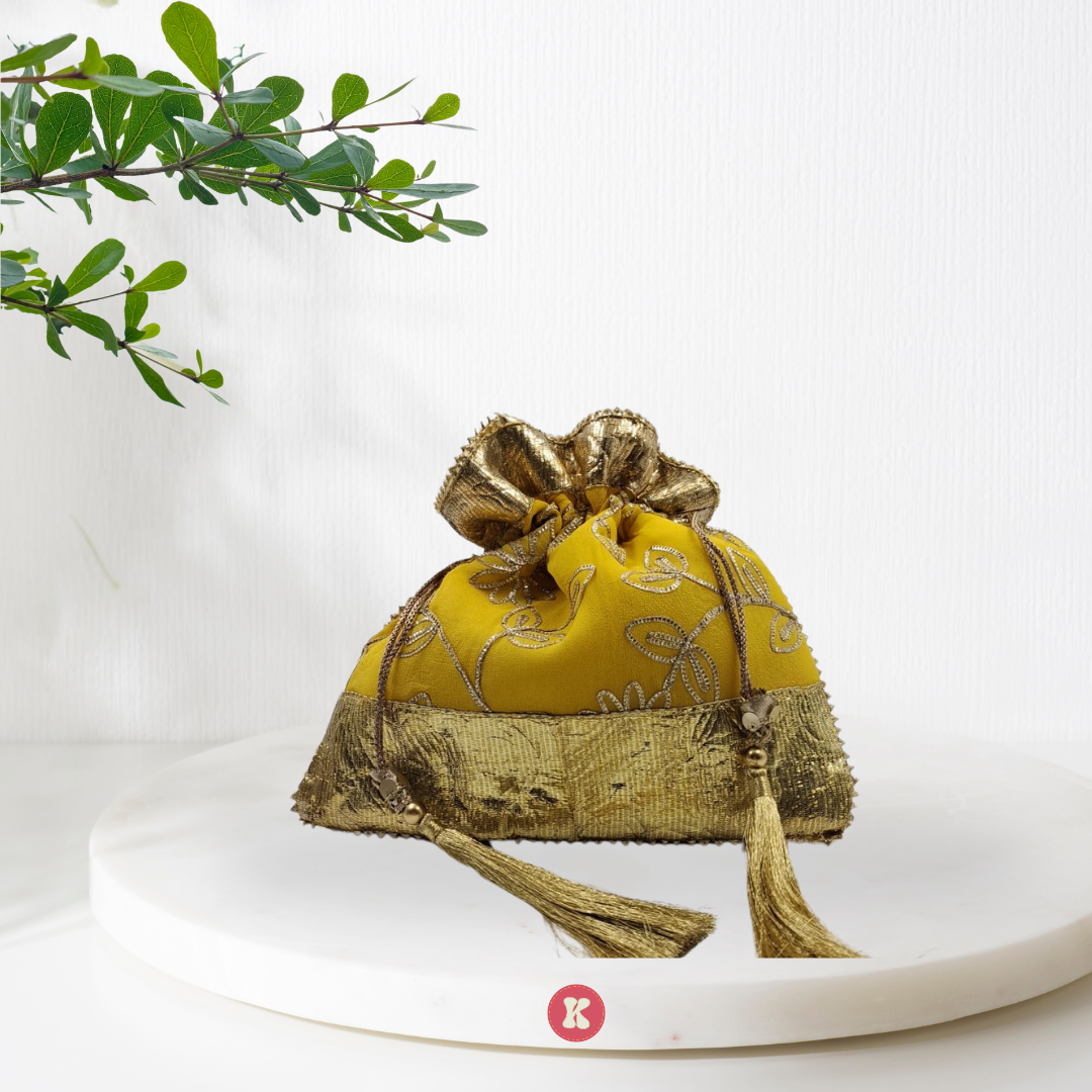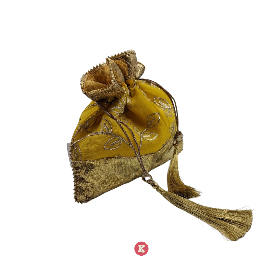 Elegant potli bag with floral embroidery and a golden textured border—perfect for traditional occasions.