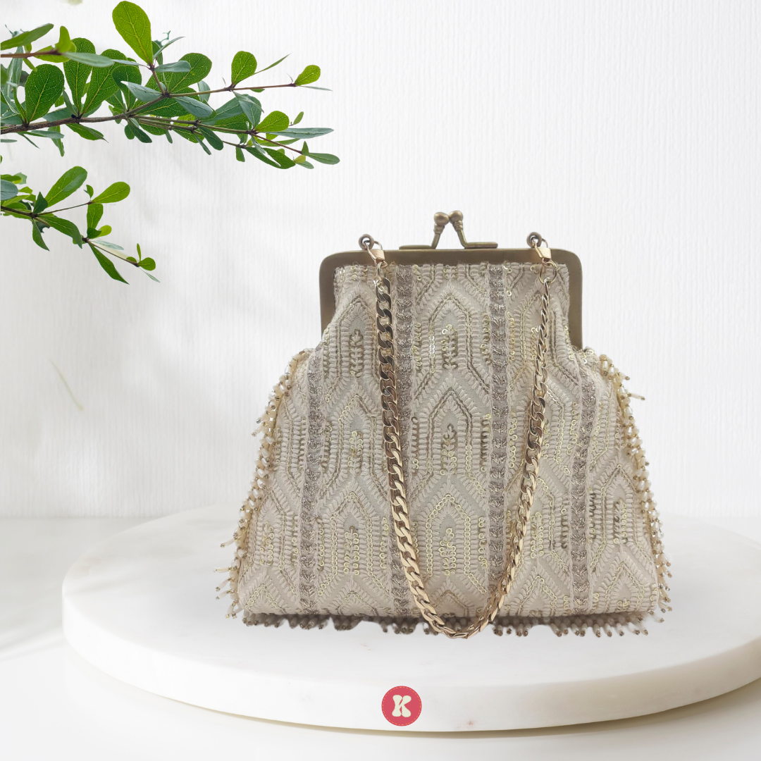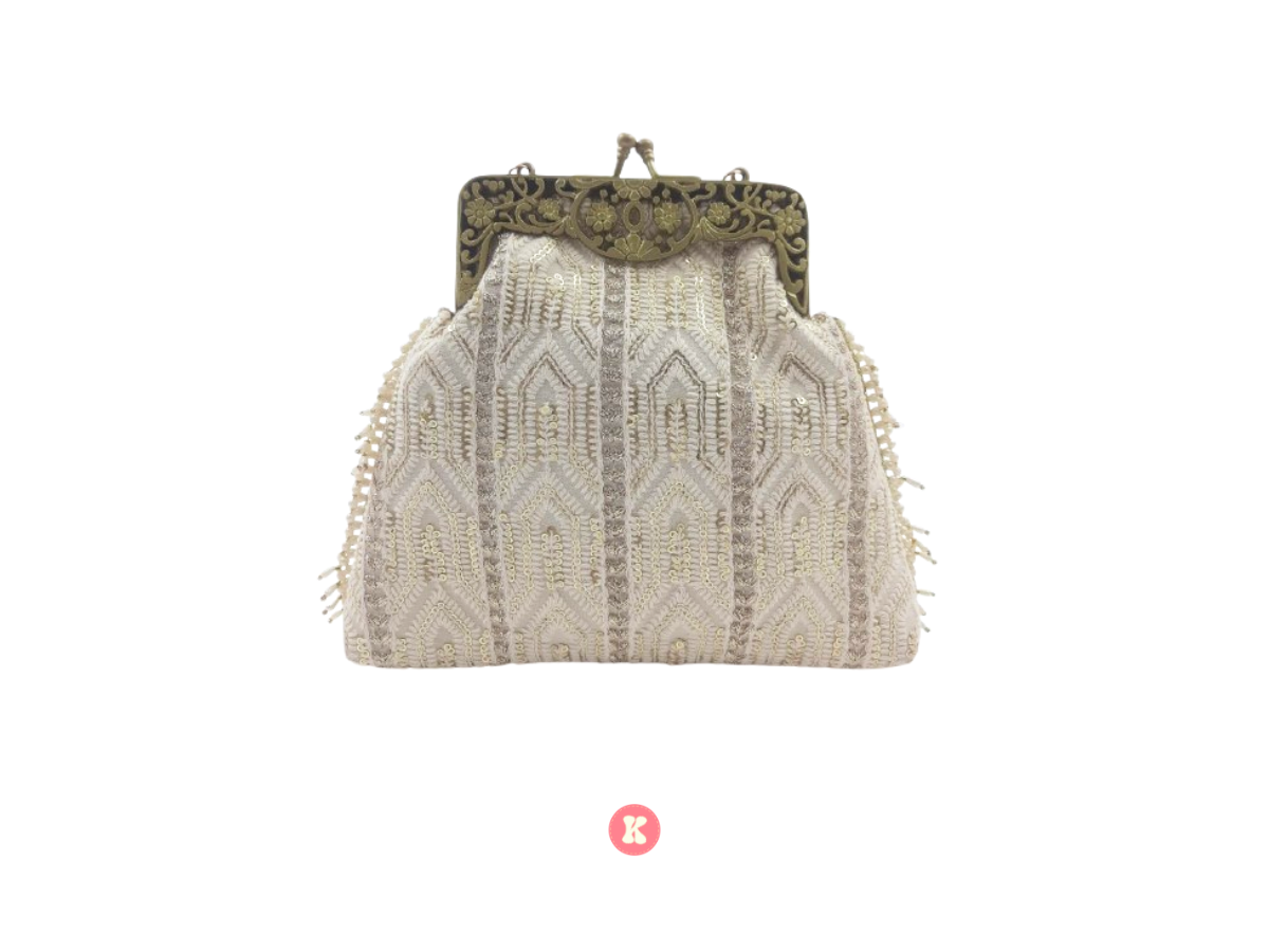 A ivory clutch with intricate gold embroidery and a vintage-style metal clasp by a chic gold chain.