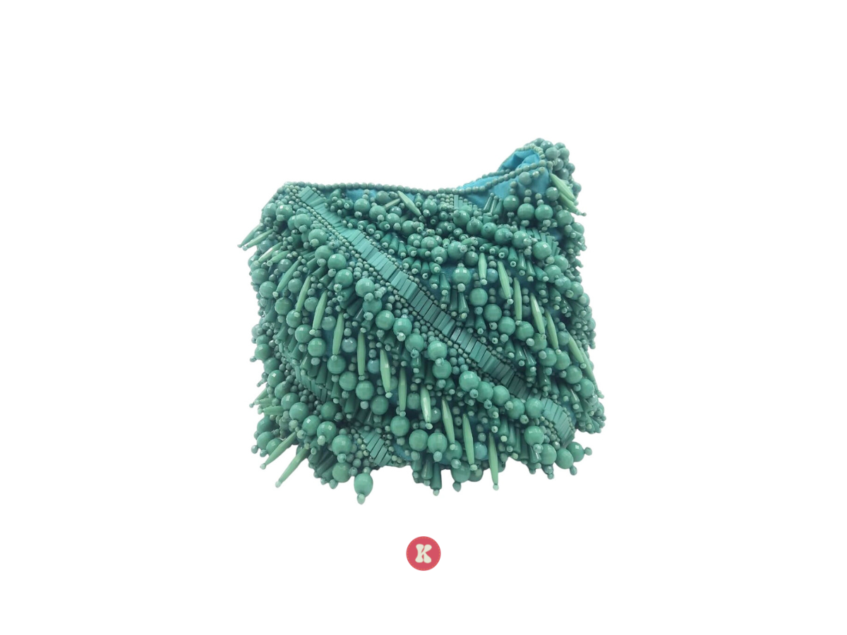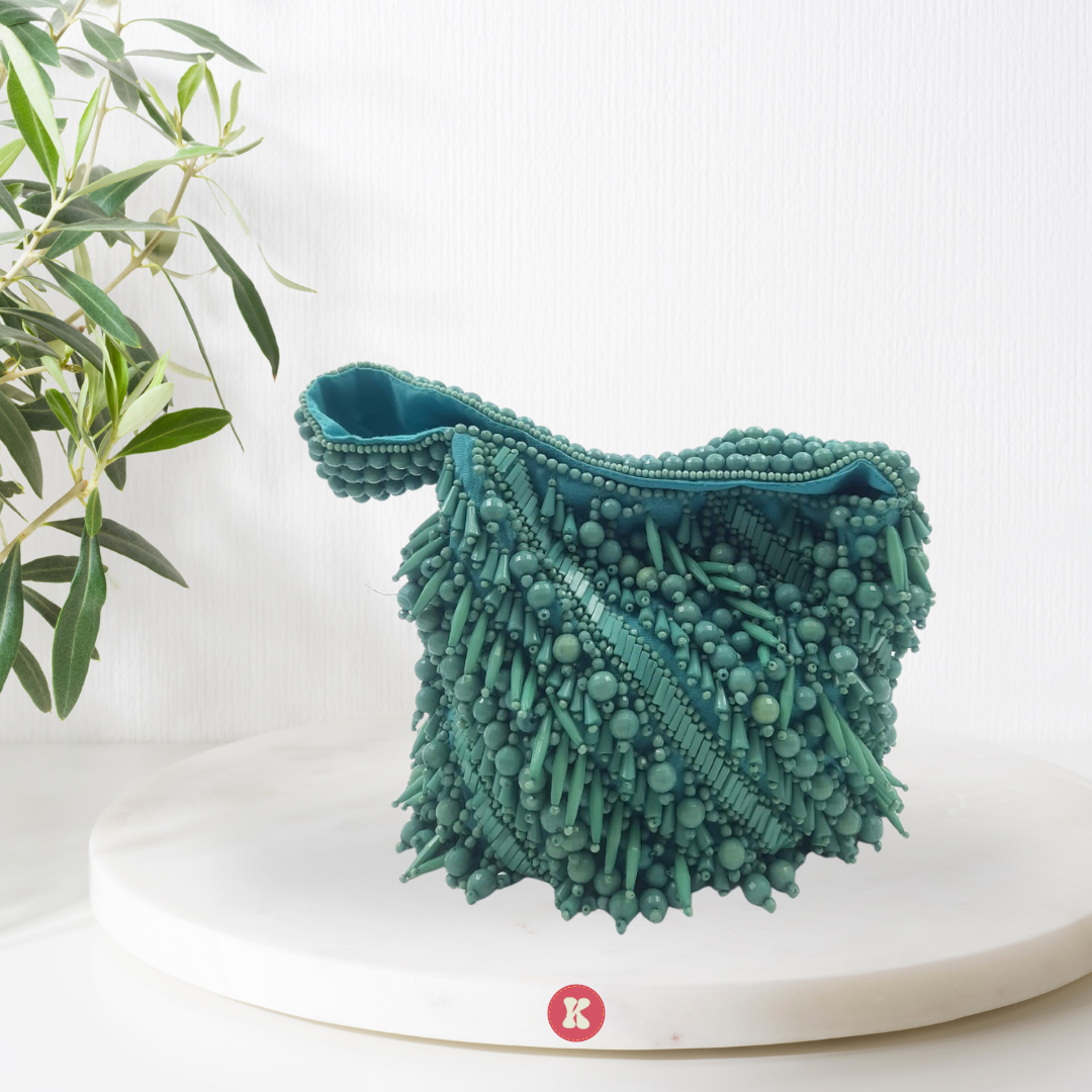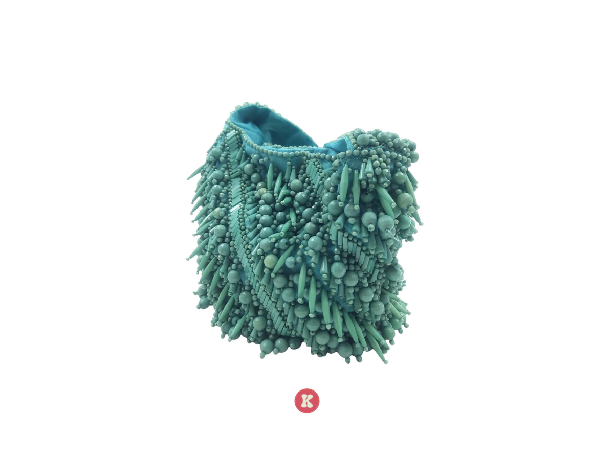 The Bloom Bead Bag features a refreshing teal hue with a unique, textured bead design. This bag is crafted to carry essentials with a playful, statement style, making it a standout accessory for casual or festive outings.