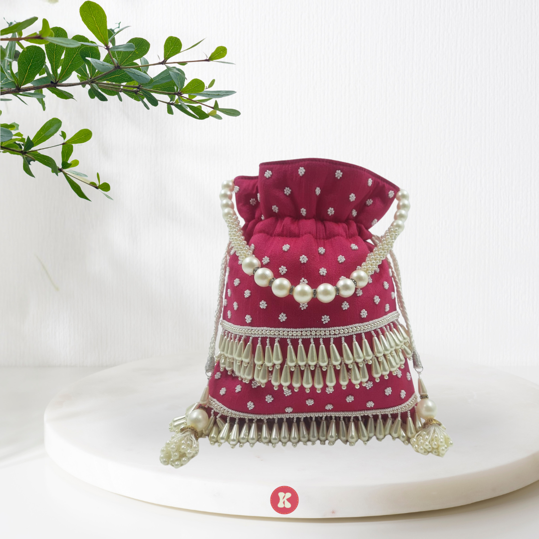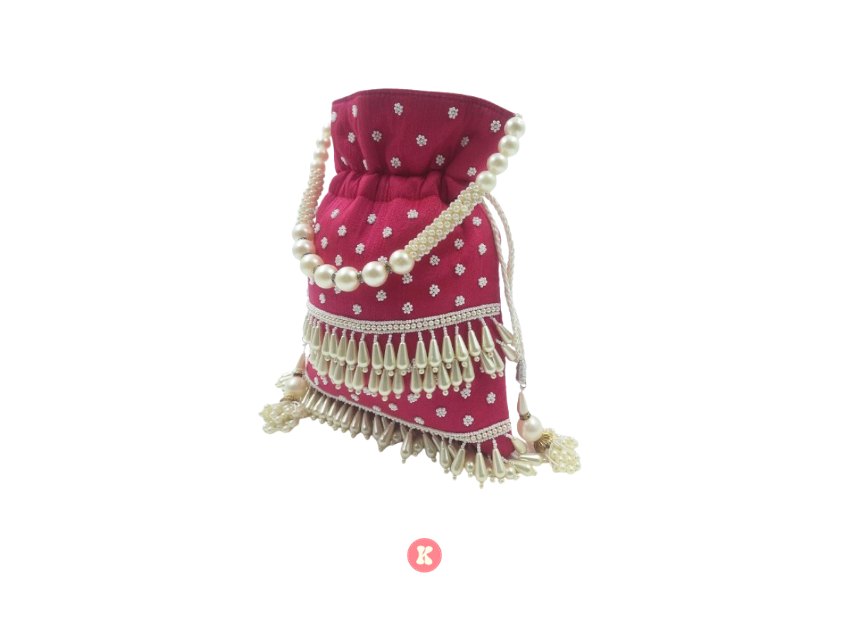A charming pink potli bag adorned with delicate white floral embroidery, elegant pearl strings, and tassel.