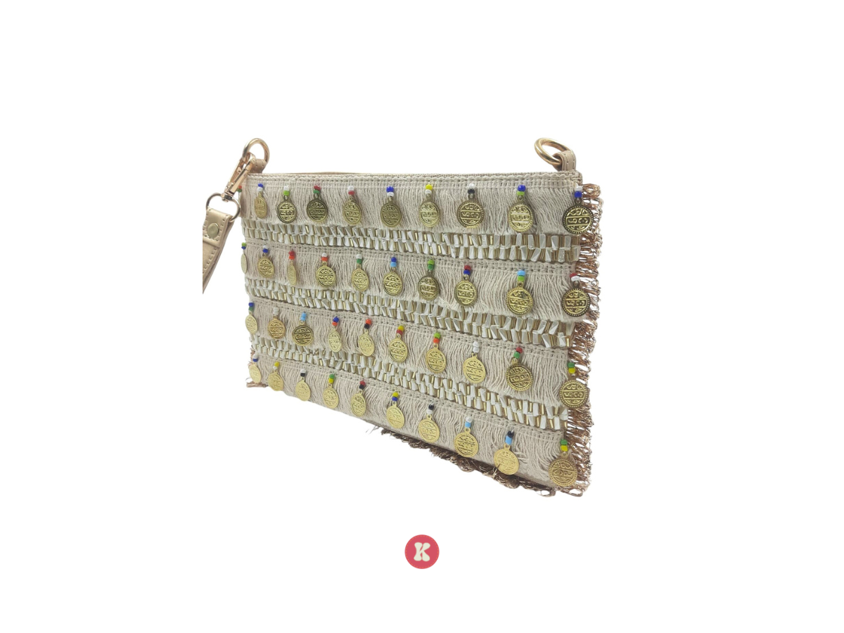 This is a boho-style clutch featuring fringed fabric, colorful bead accents, and metallic coin embellishments. Perfect for casual outings, cultural events, or adding a quirky touch to everyday wear.