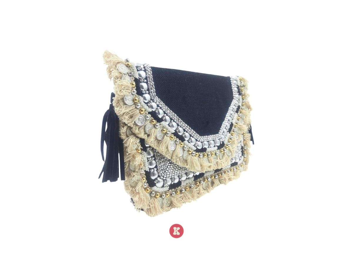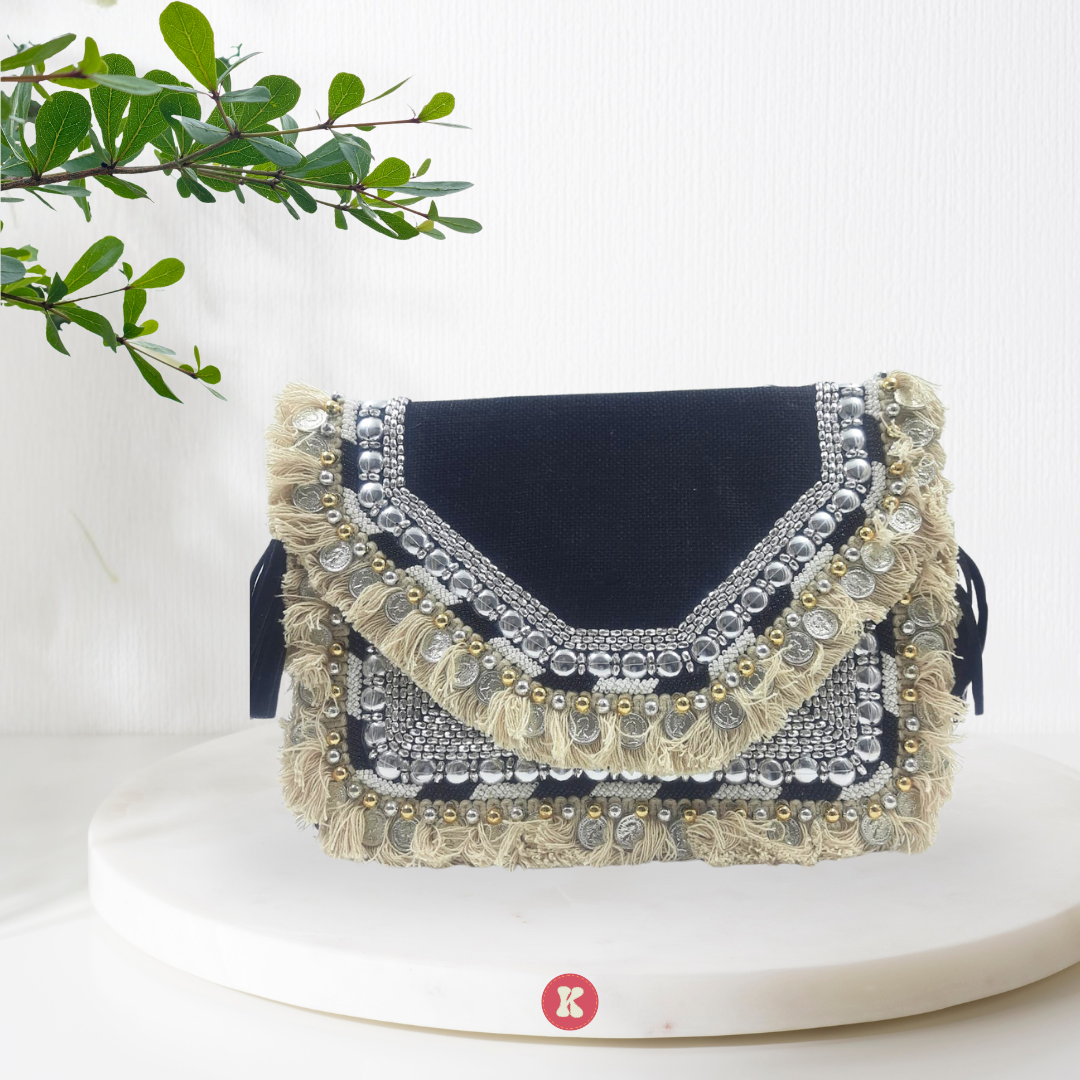 The Midnight Coin Embellished Bag combines a dark, textured base with shimmering silver and gold coin details and fringe accents. This bag is perfect for adding a touch of bohemian glamour to evening looks.