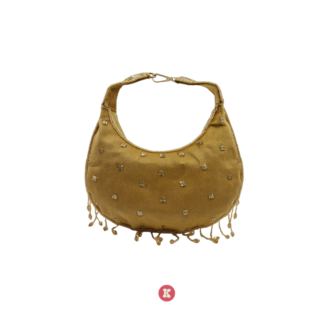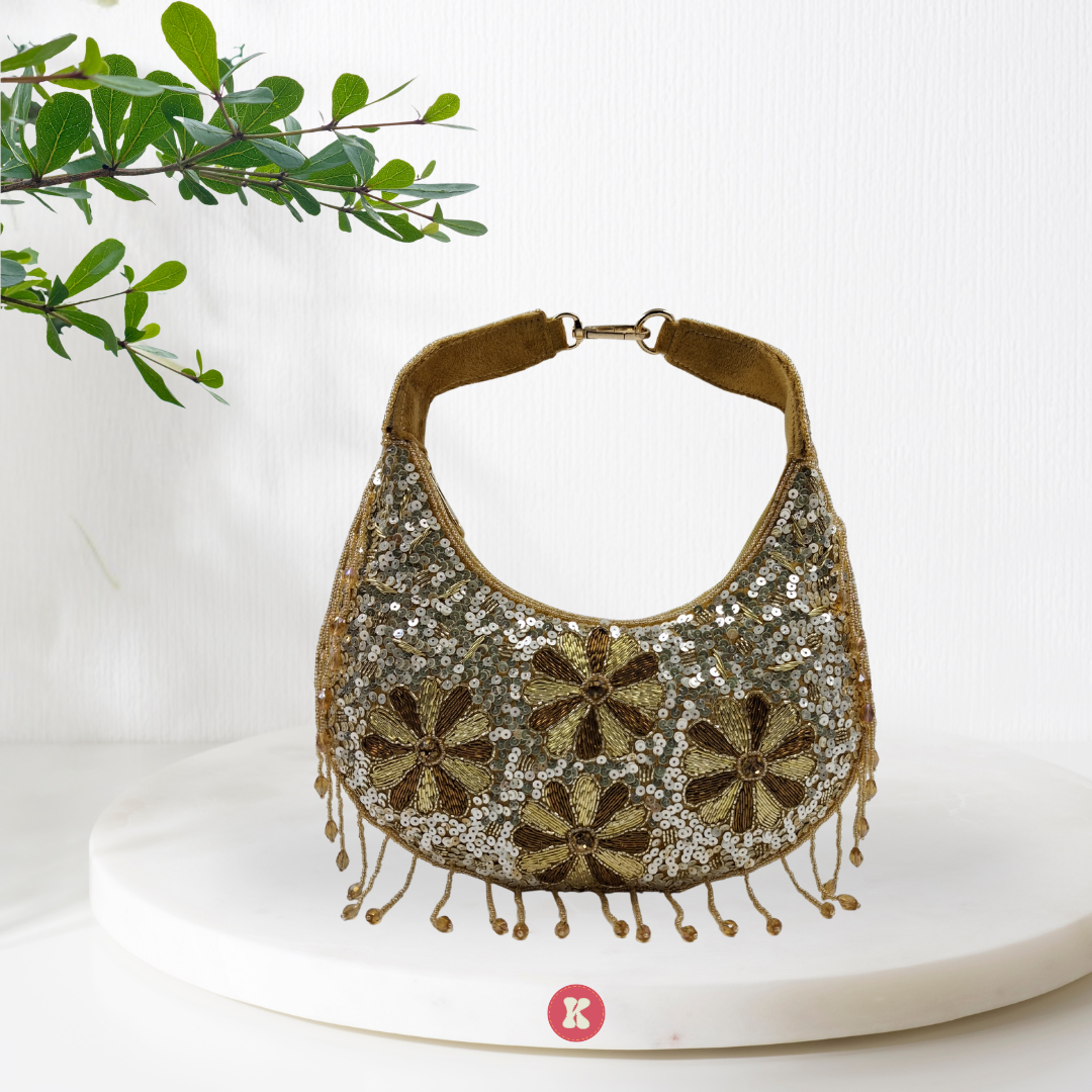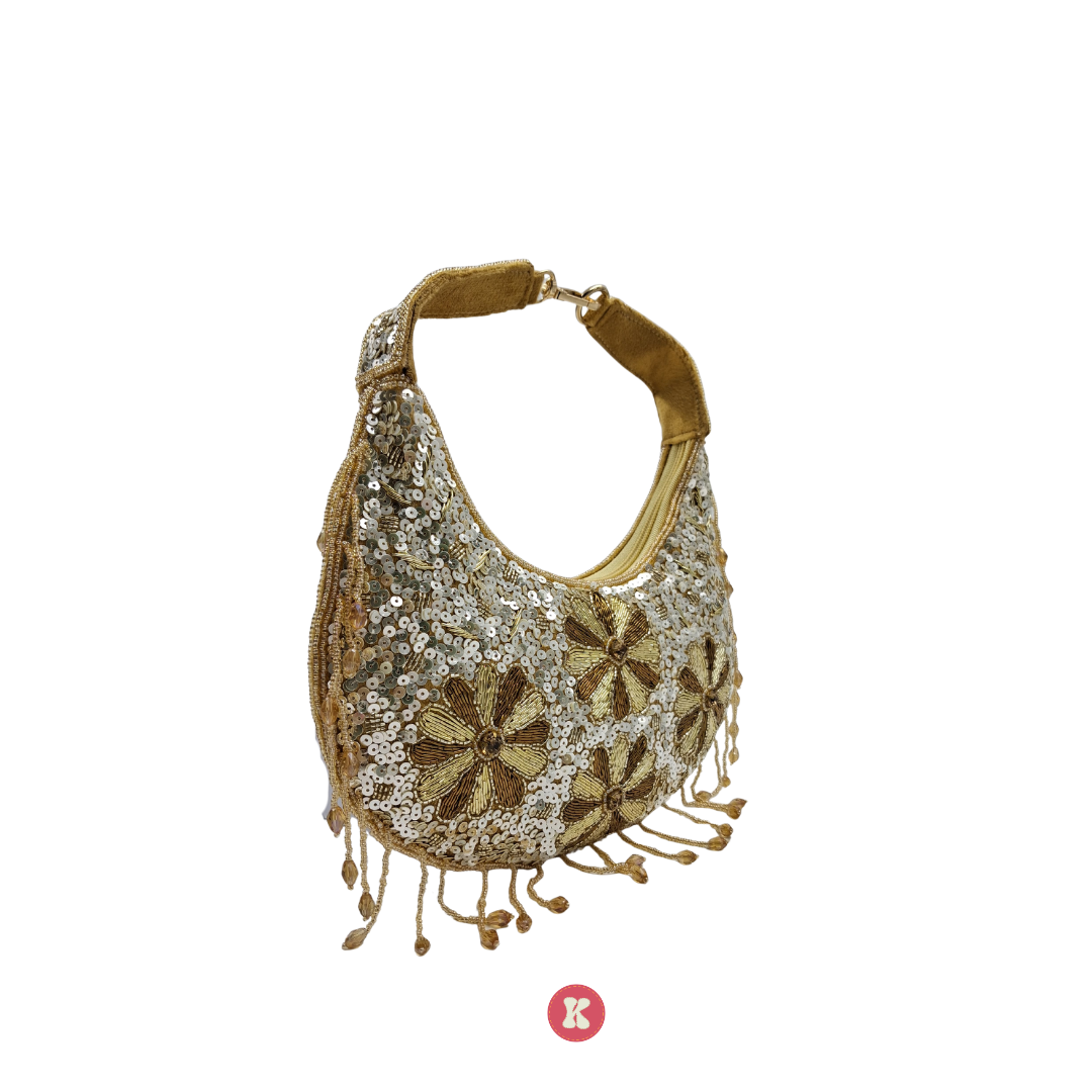 Elegant floral sequin hobo bag adorned with golden beads and sparkling fringe for a festive finish.