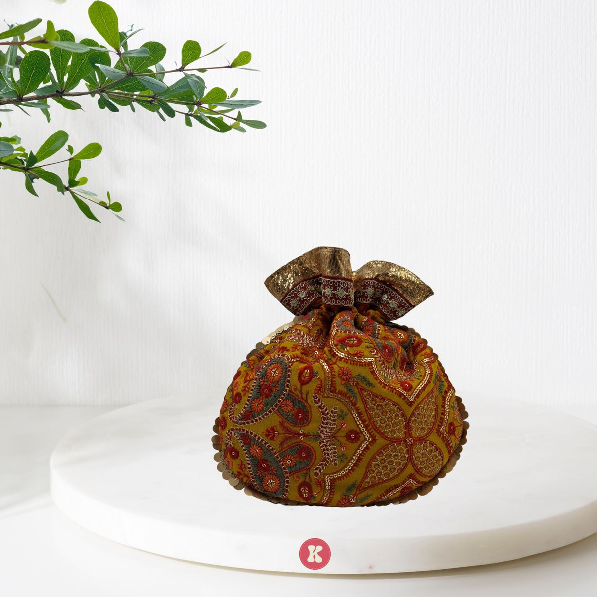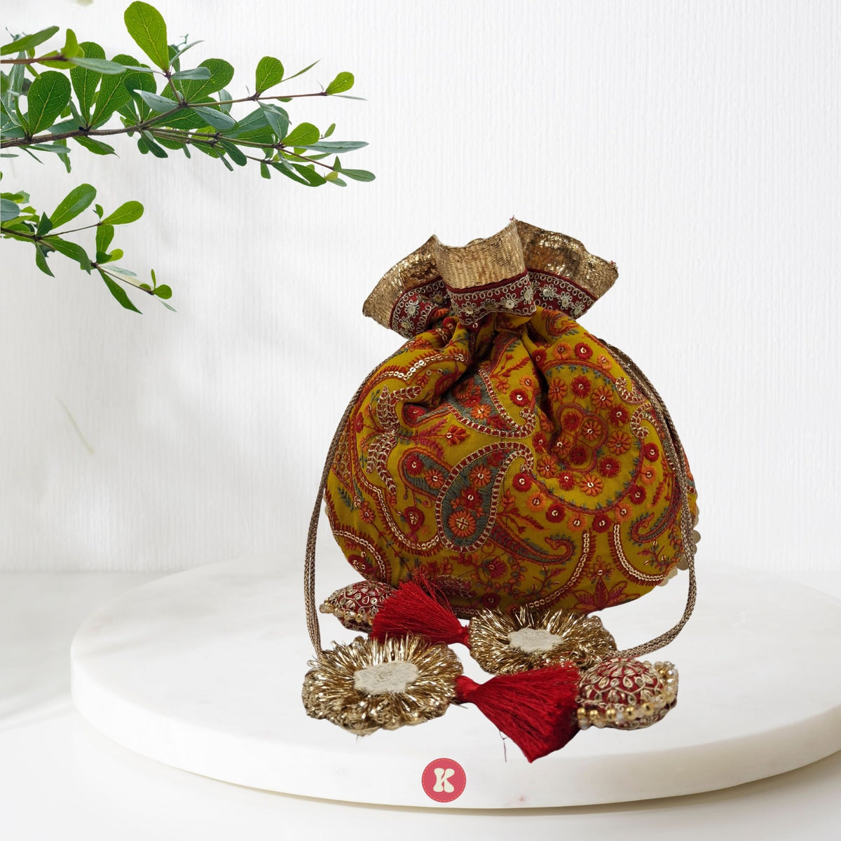 Elegant golden potli bag with red paisley embroidery, mirror work, and tassel accents for festive occasions.