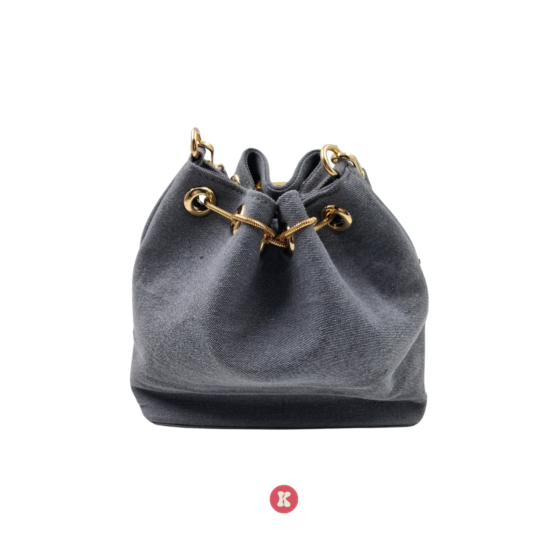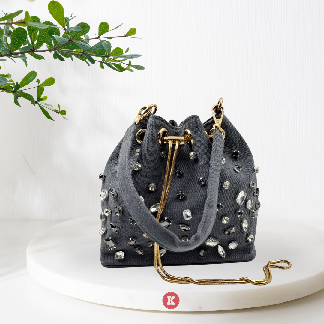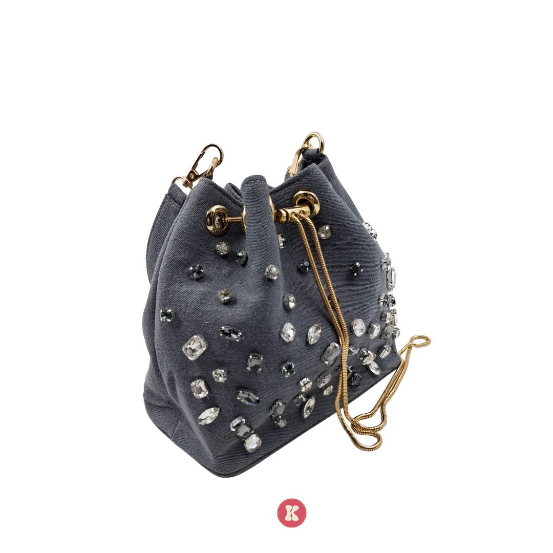 A plush dark-toned bucket bag encrusted with shimmering crystals and finished with luxe gold accents