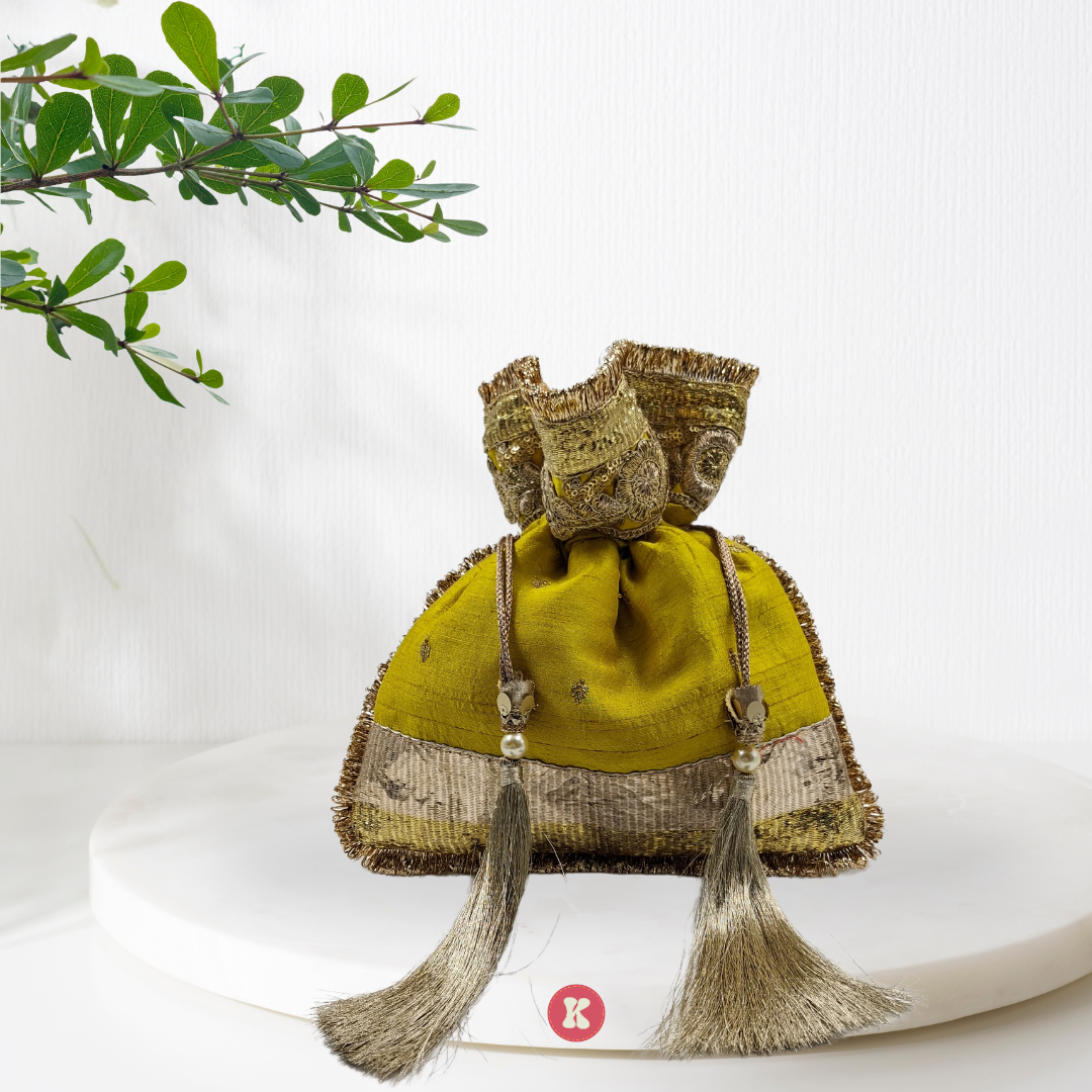 A rich olive-green potli with delicate golden motifs and a shimmering border